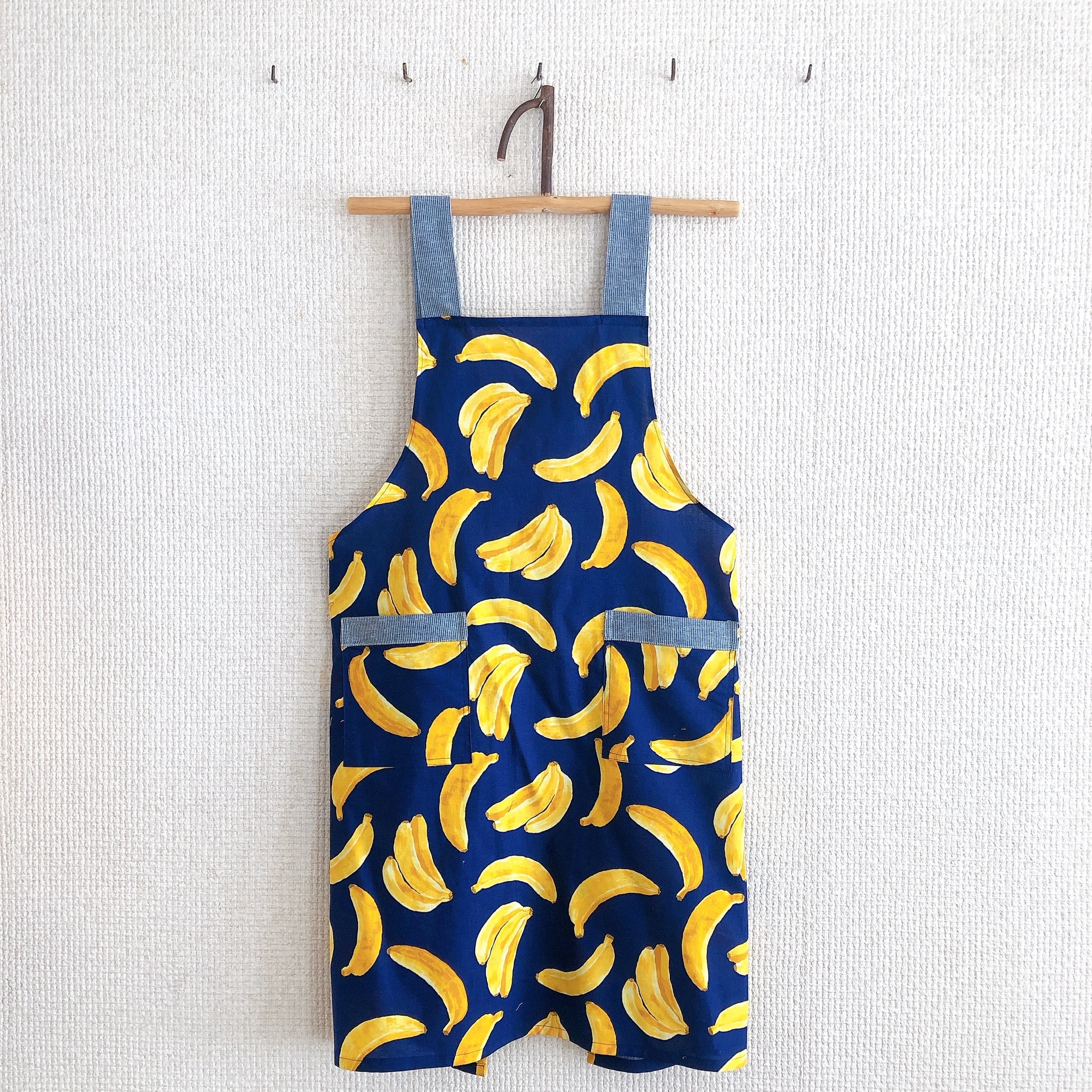 肩ひも後ろはHの形。おとなエプロン(バナナ)