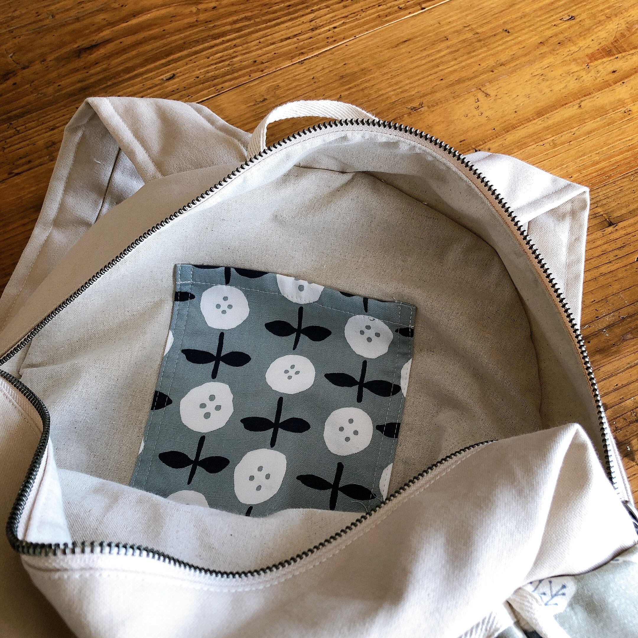 本体は11号のハンプと柄の生地は芯を張った綿麻の生地を使い、