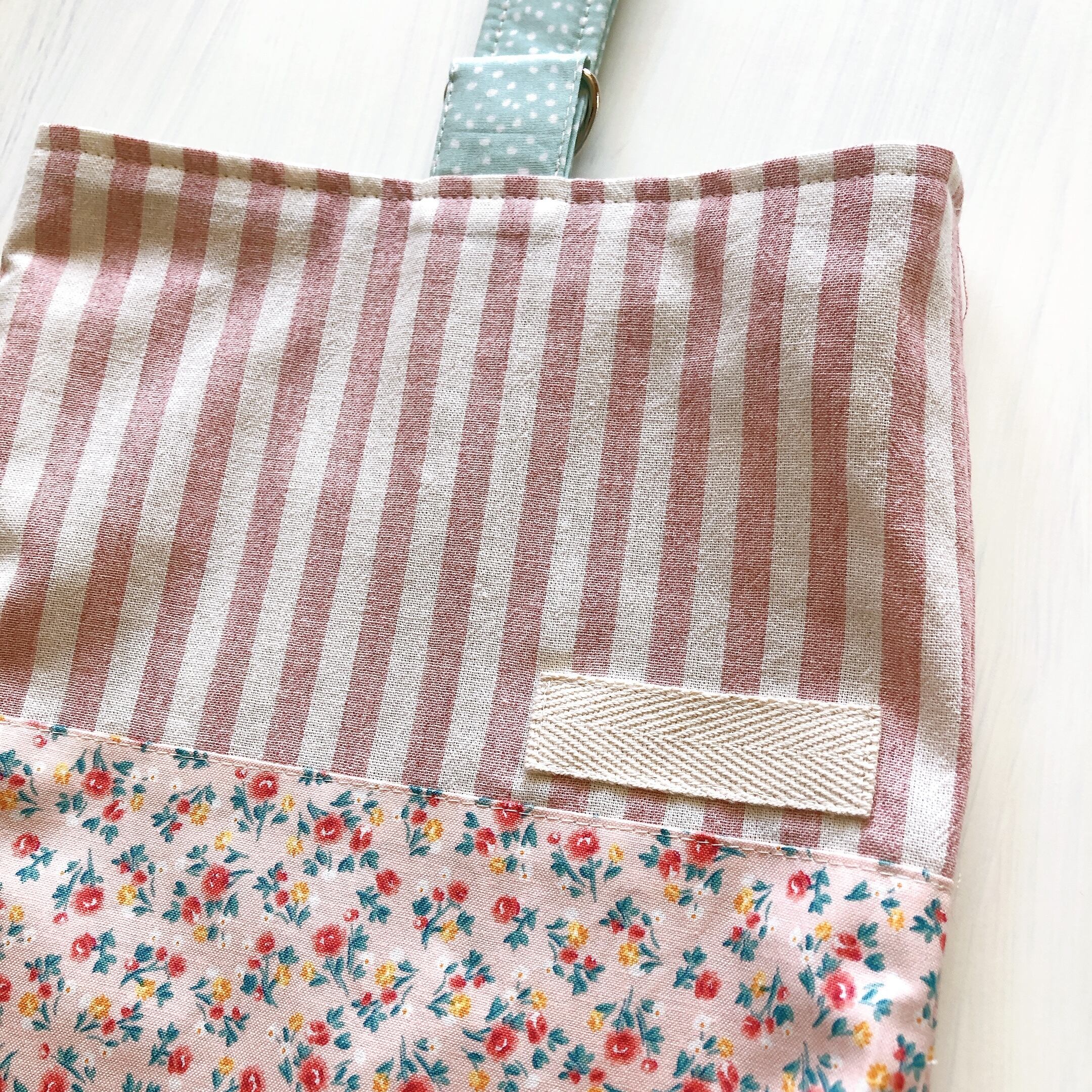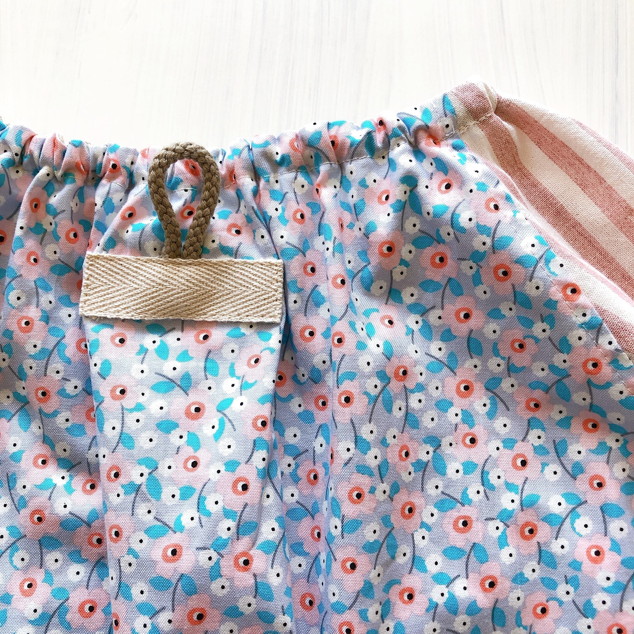 園で洋服掛けのフックに引っ掛けることができるように紐もつけました。