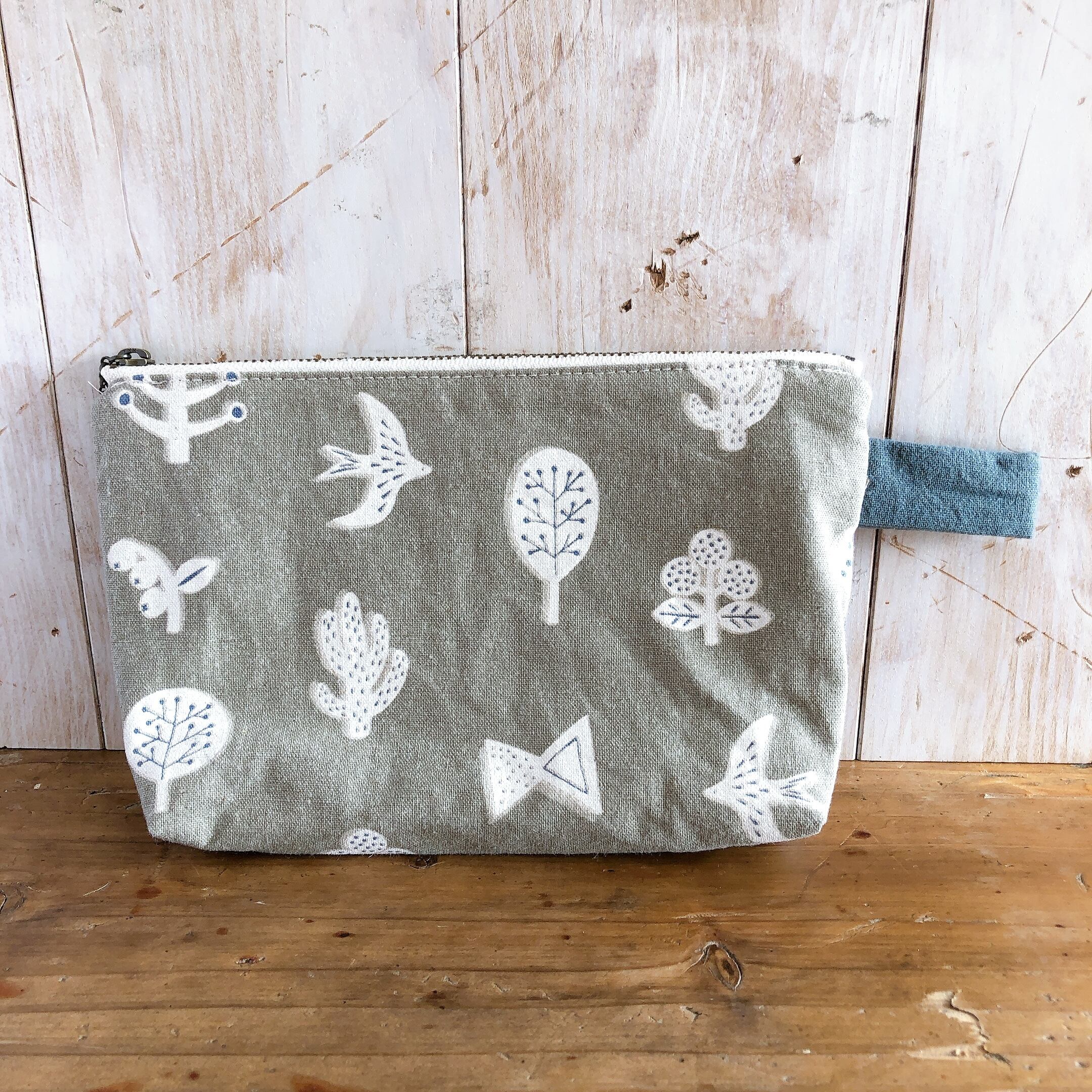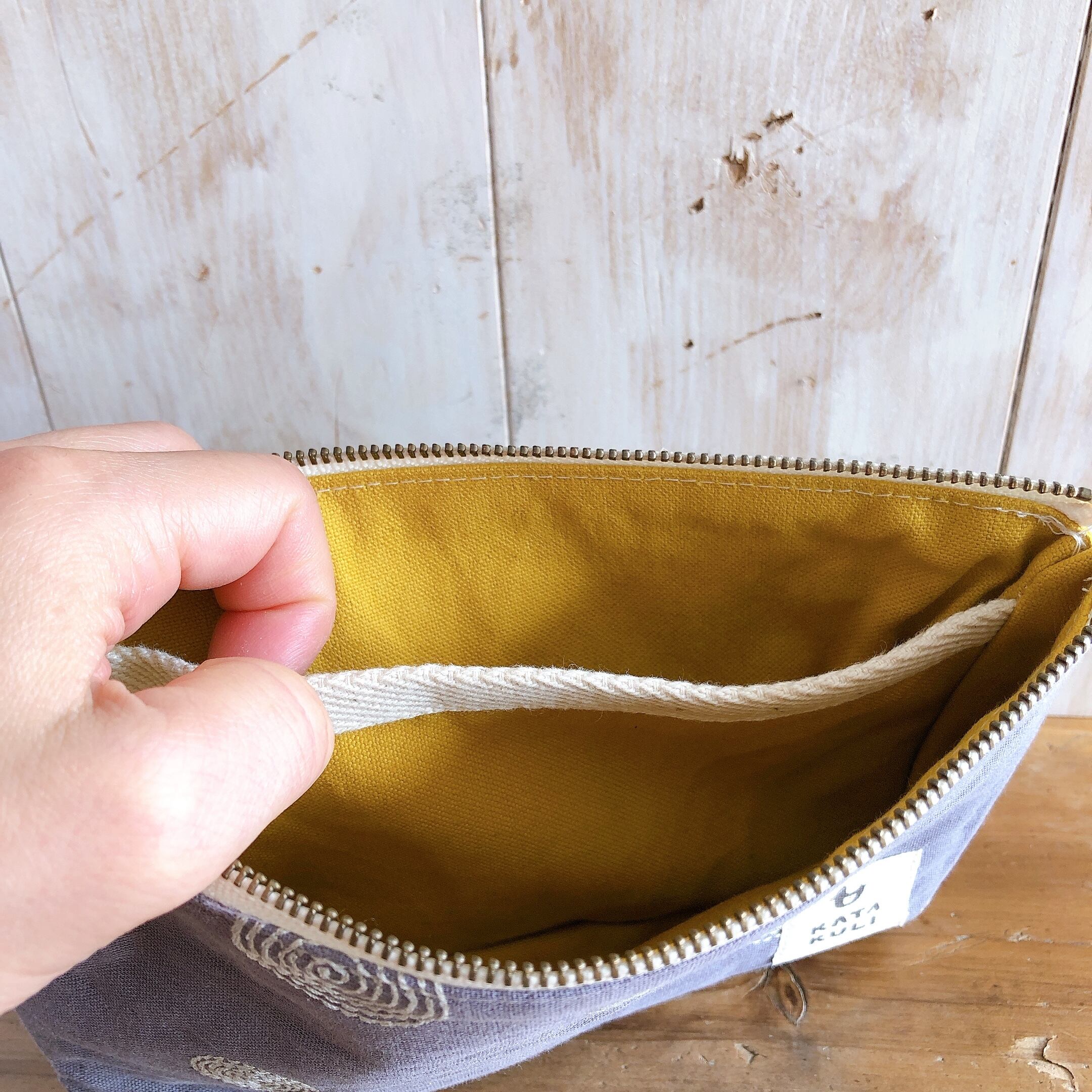 仕切りのあるポーチ(木と鳥×刺繍ぐるぐる)