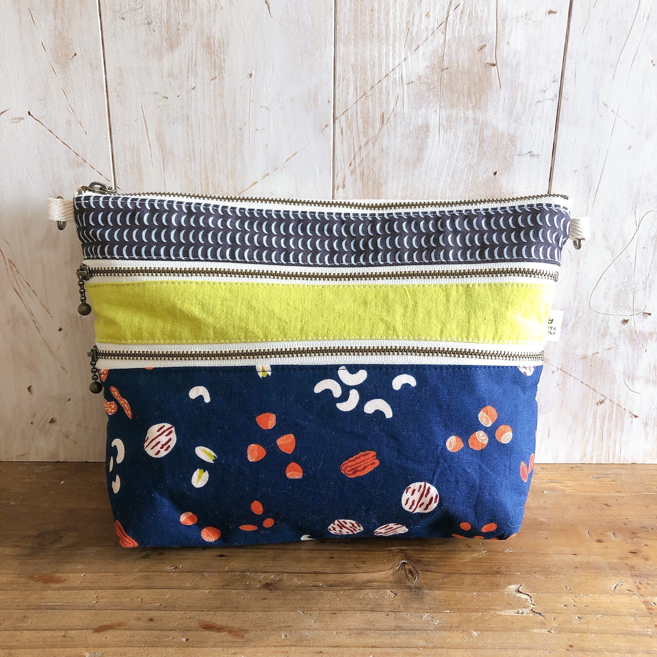 マチ付き3ファスナーポーチ*ポシェットにも♪(お豆×りんご)