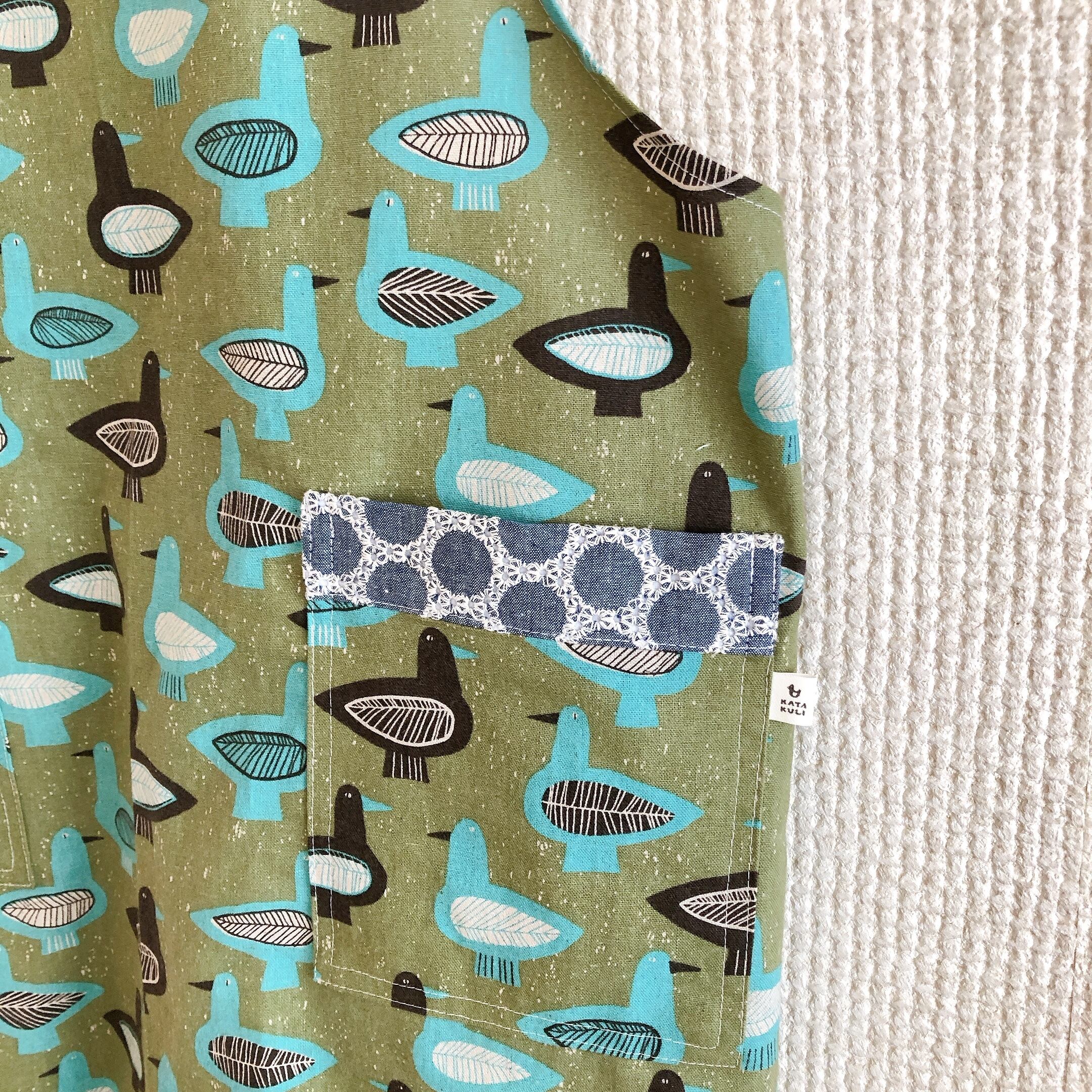 肩ひも後ろはHの形。おとなエプロン(バード・カーキ)