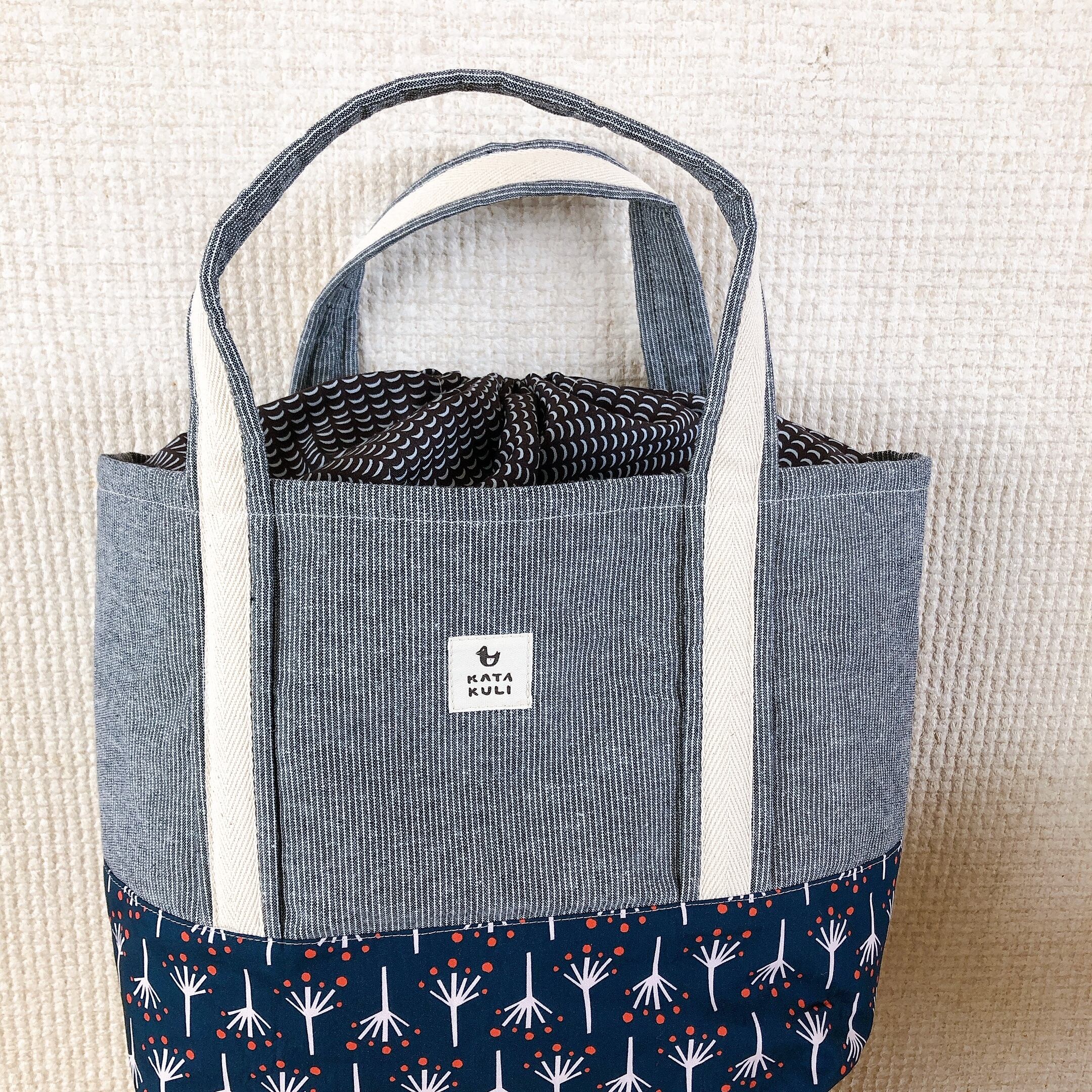 トート下部分の柄生地は綿麻の生地に接着芯を張って強度を強めています。