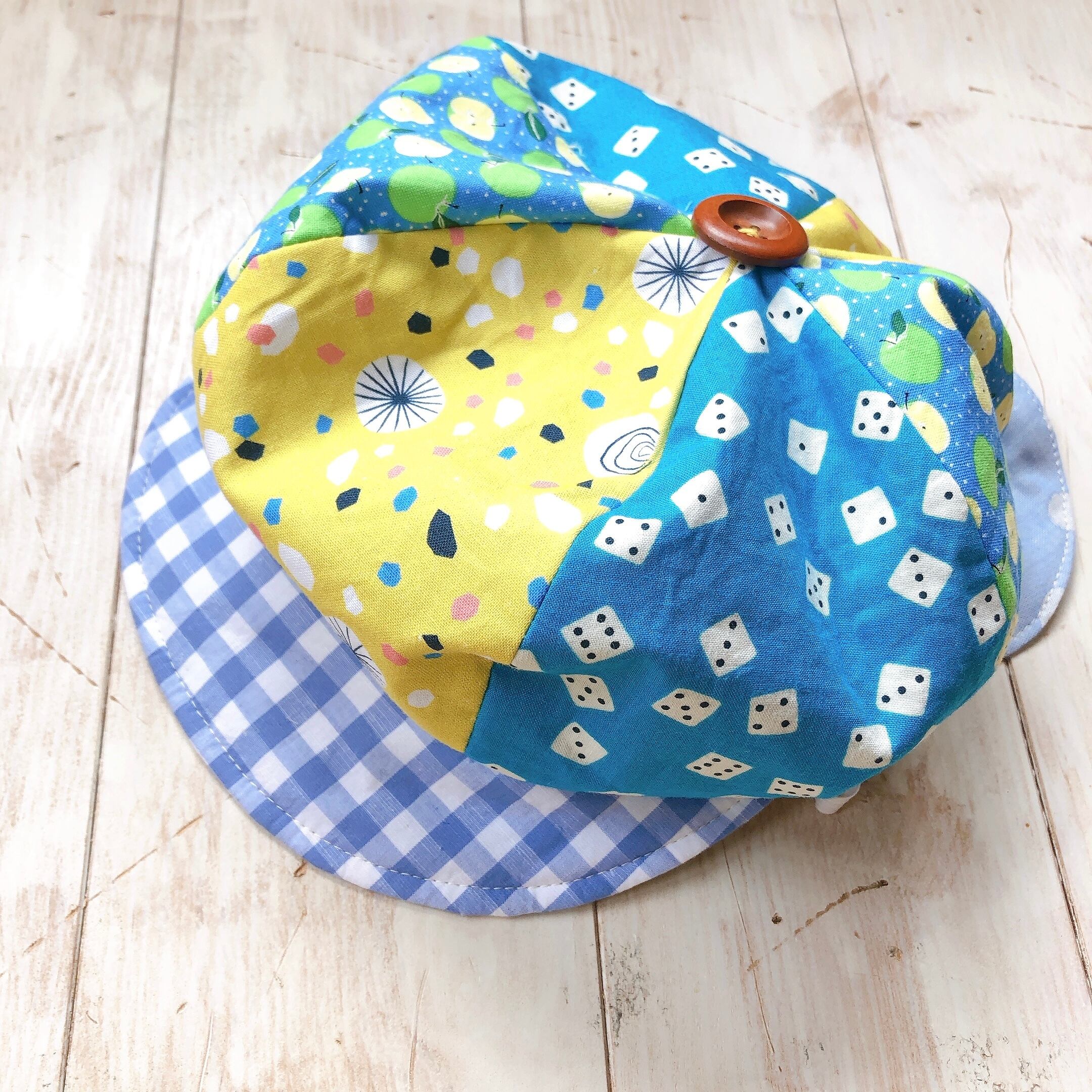 相性の良い3種類の生地を組み合わせて賑やかなキャスケットにしてみました。