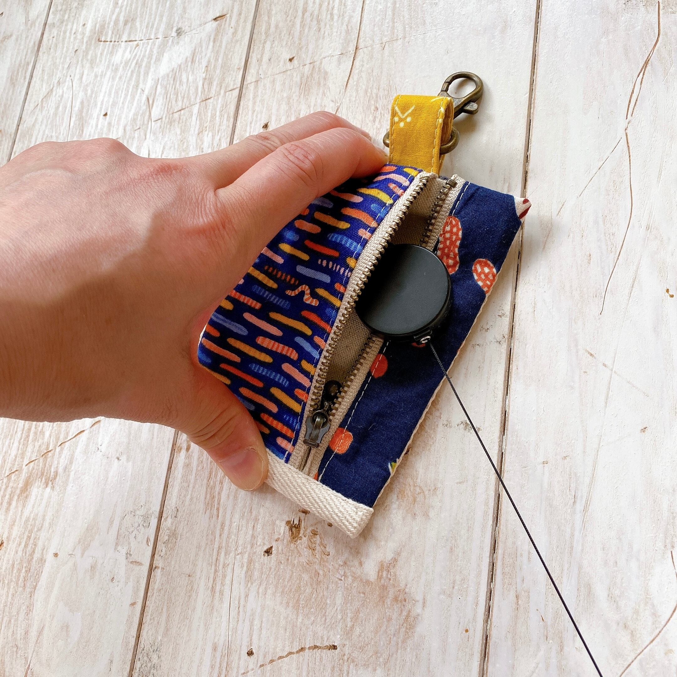 ファスナー付きのポーチの中にあるリールに鍵をつけて