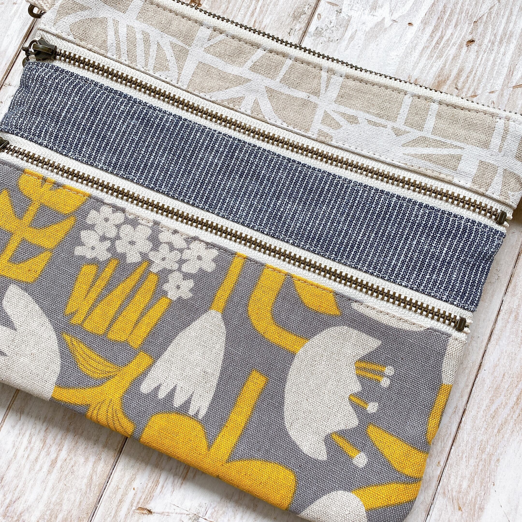 3ファスナーフラットポーチ*マスク入れにも♪ポシェットにも♪(黄色フラワーとカーキバード)