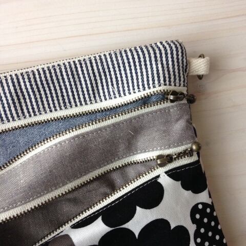 ファスナー開きのお部屋が3つある薄型ポーチです。