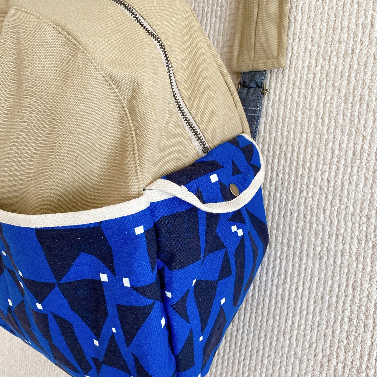 本体は11号のハンプと柄の生地は芯を張った綿麻の生地を使い、
