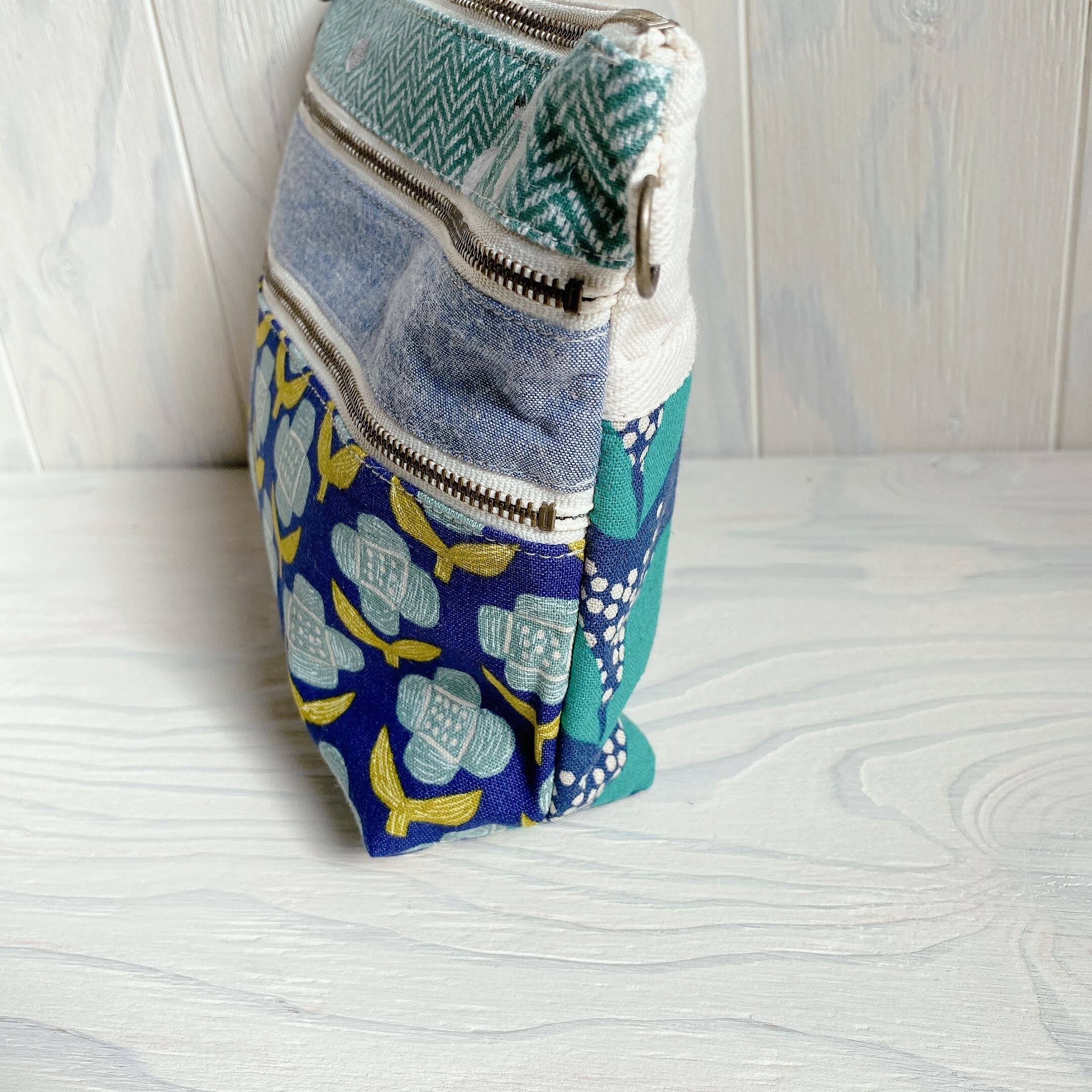 マチ付き3ファスナーポーチ*ポシェットにも♪(青フラワー)