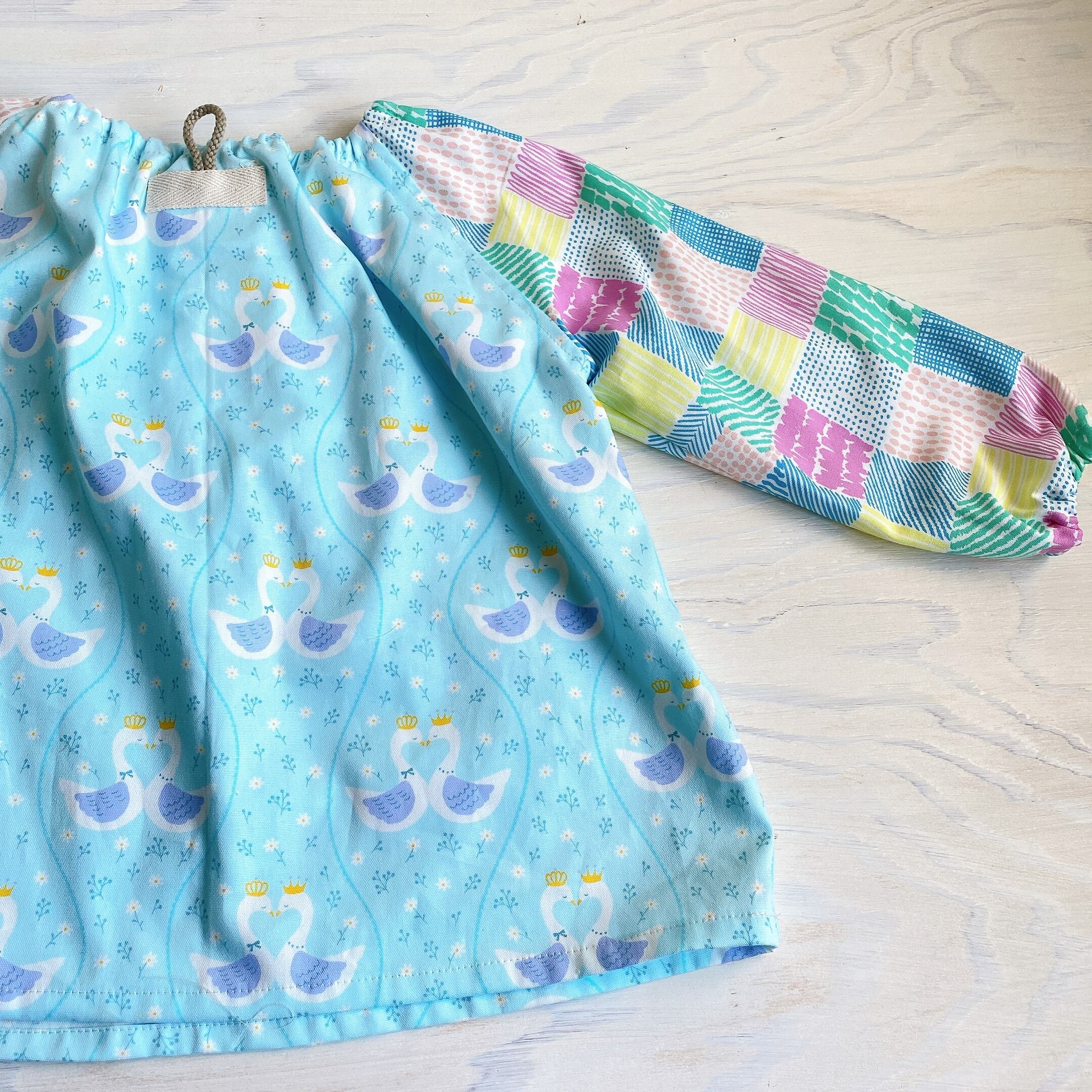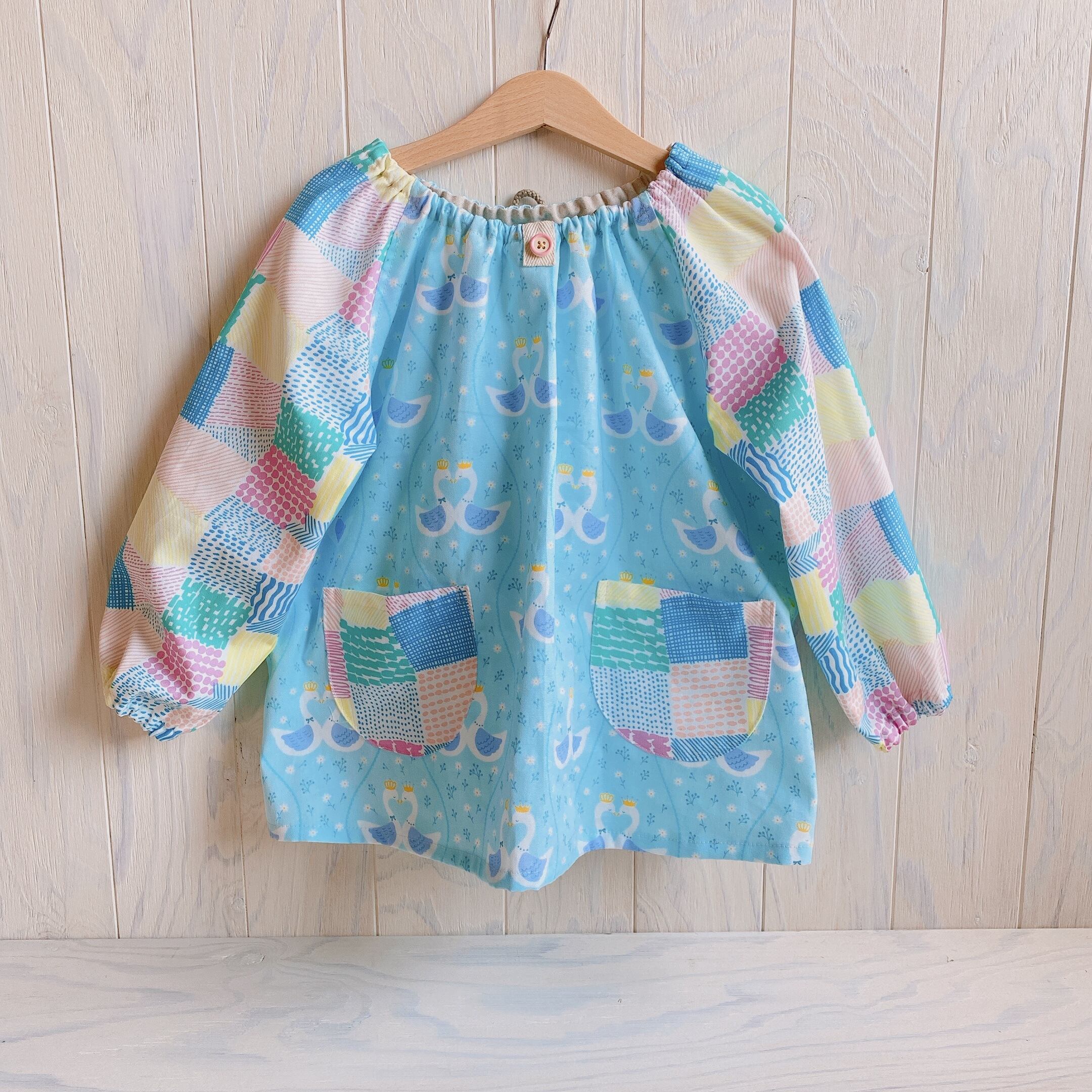 ふんわりやさしい色合いのこどもらしい生地でスモックを作りました。