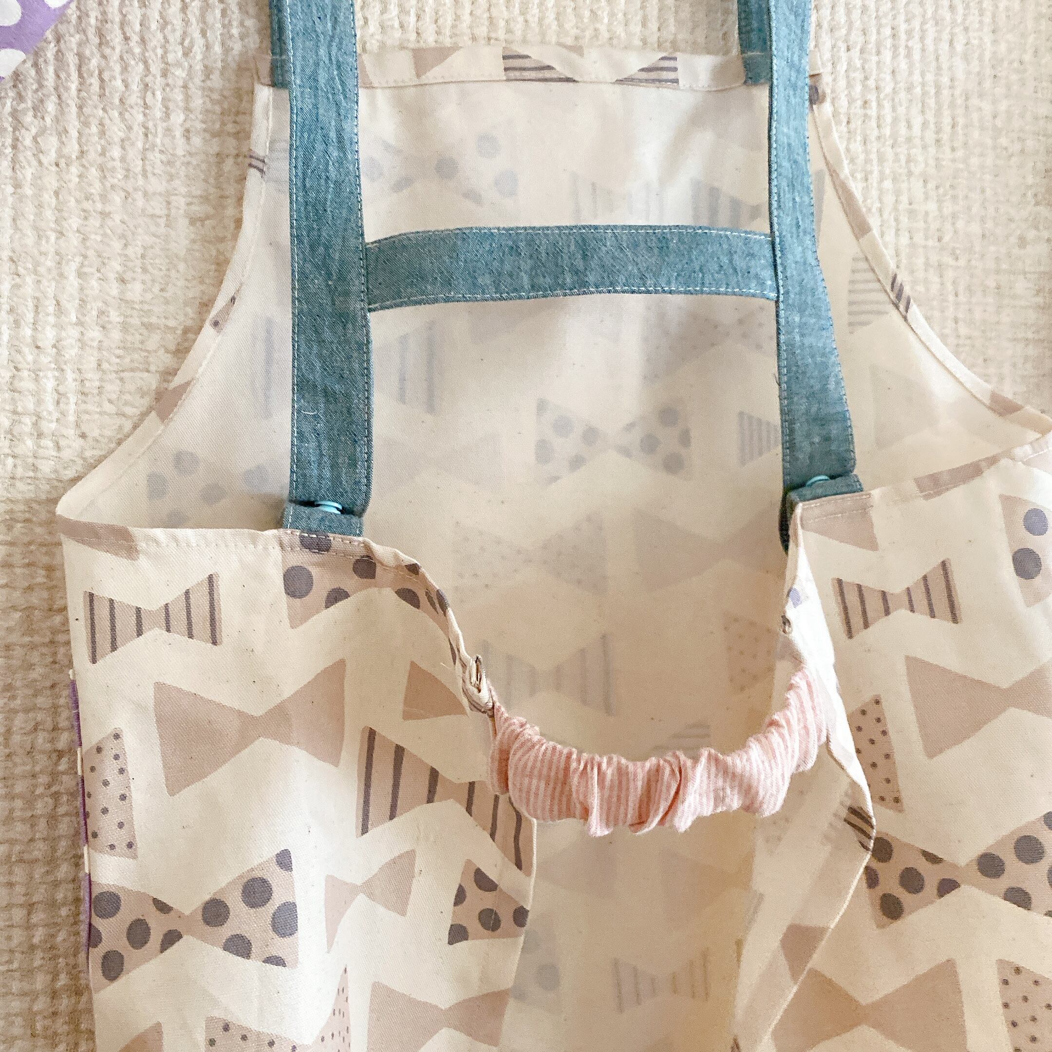エプロンの後ろはシュシュのようにゴムを入れています。