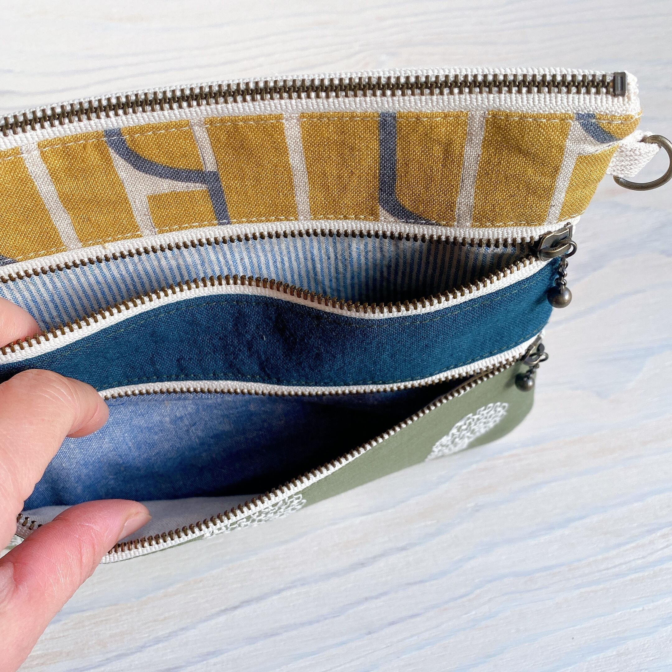 3ファスナーフラットポーチ(刺繍木と鳥)マスク入れにも♪ポシェットにも♪
