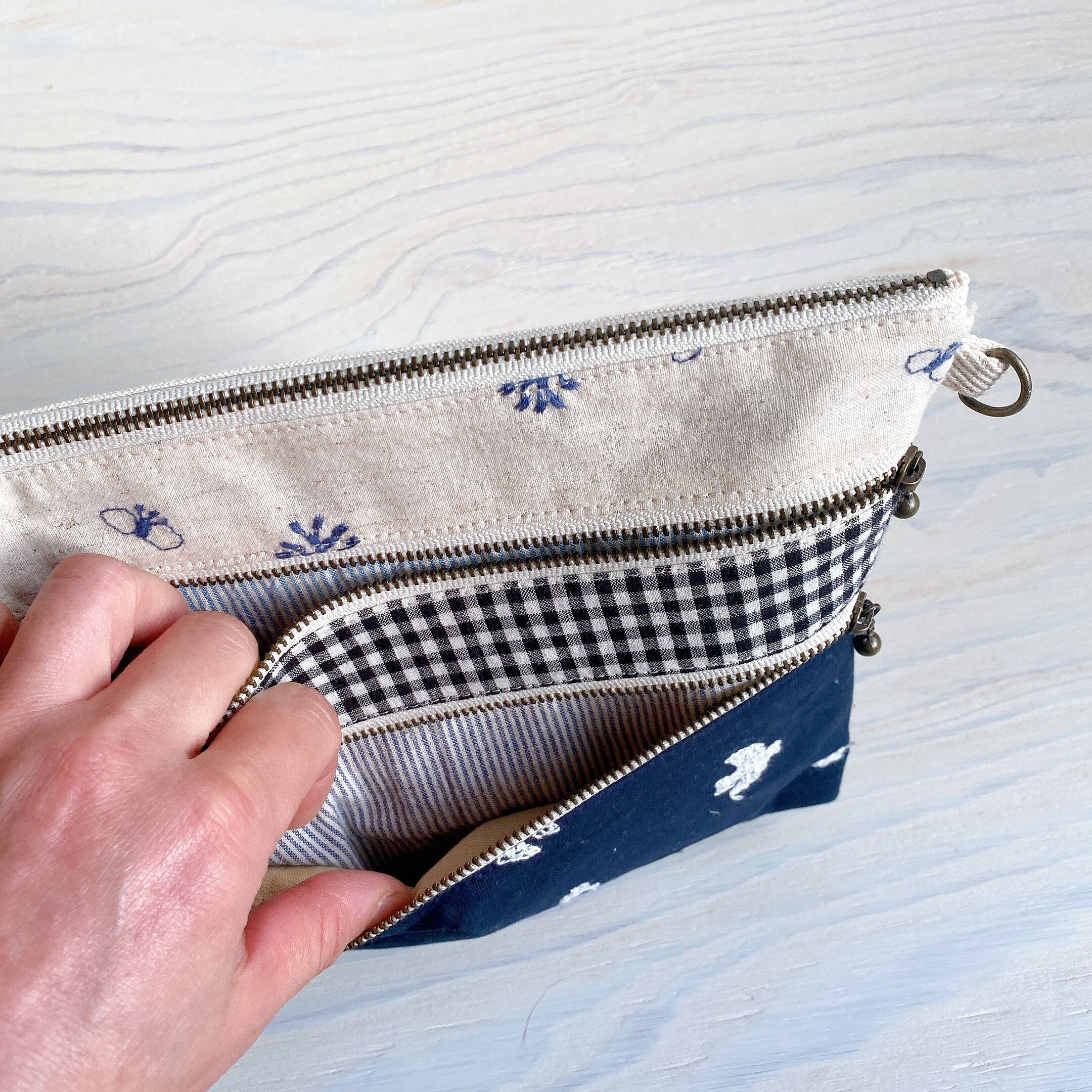 マチ付き3ファスナーポーチ*ポシェットにも♪(刺繍バード)