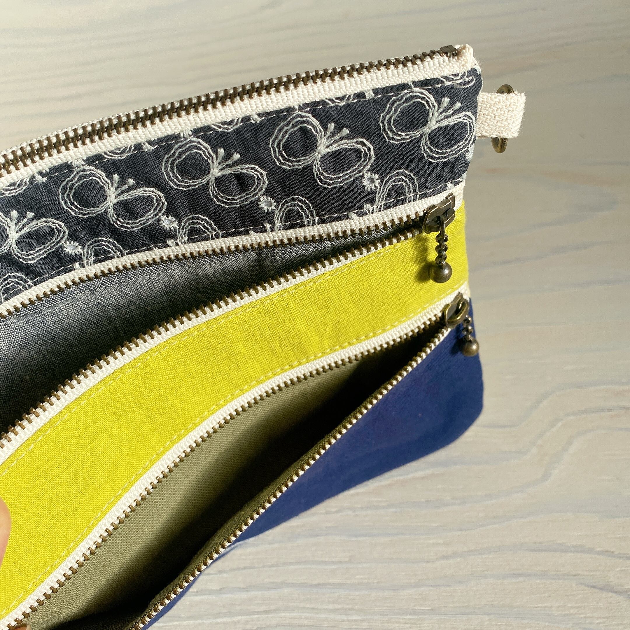 ファスナー開きのお部屋が3つあるフラットポーチです。