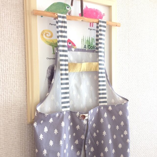肩ひも後ろはHの形。大人エプロン(ツリー。グレー)