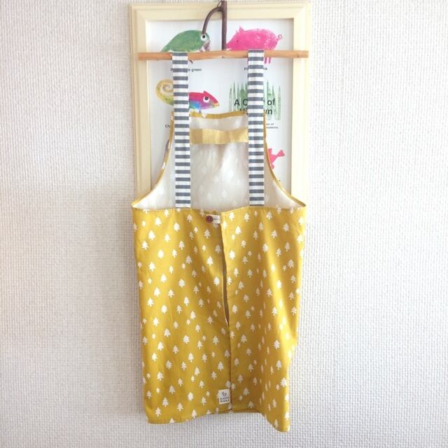 肩ひも後ろはHの形。大人エプロン(ツリー。マスタード)