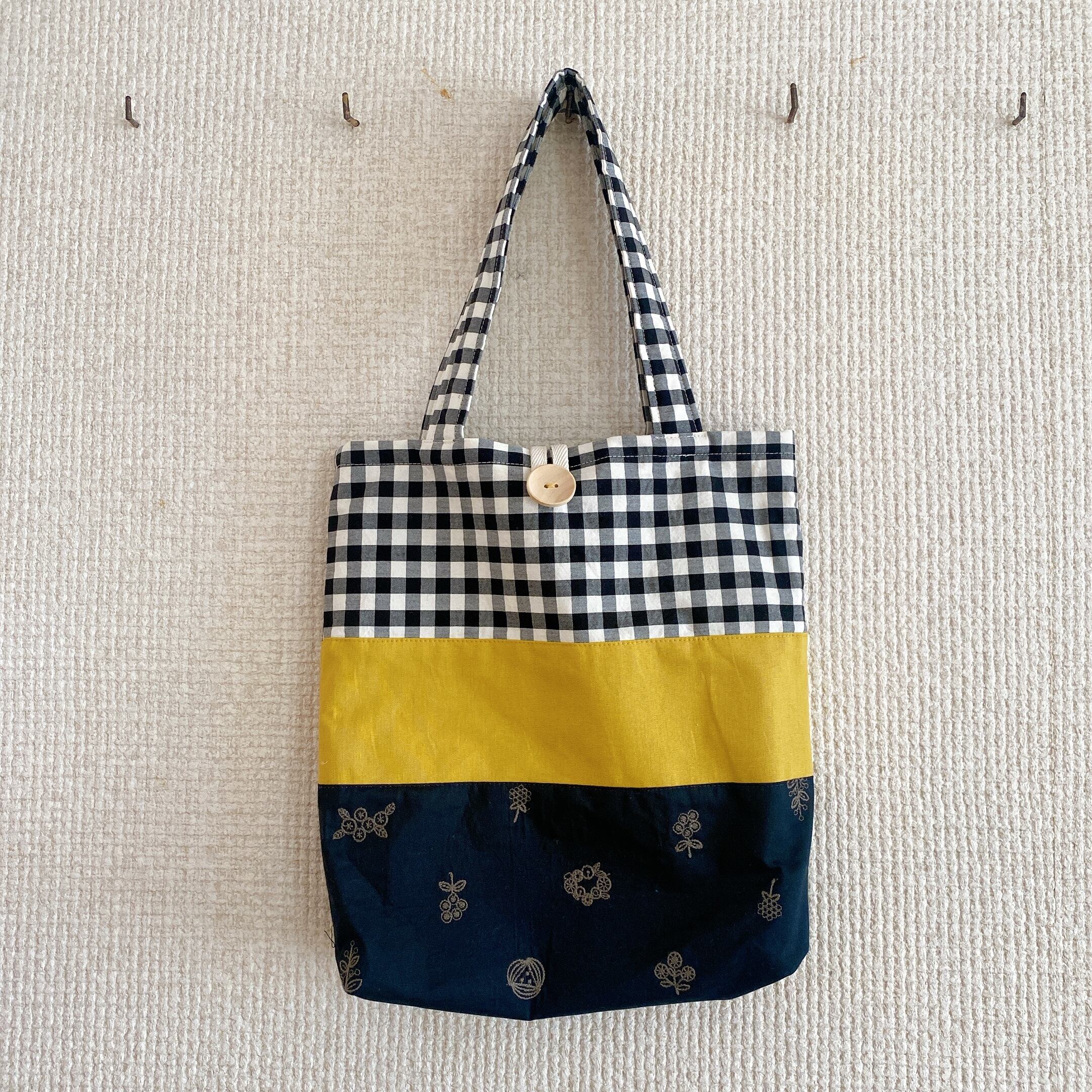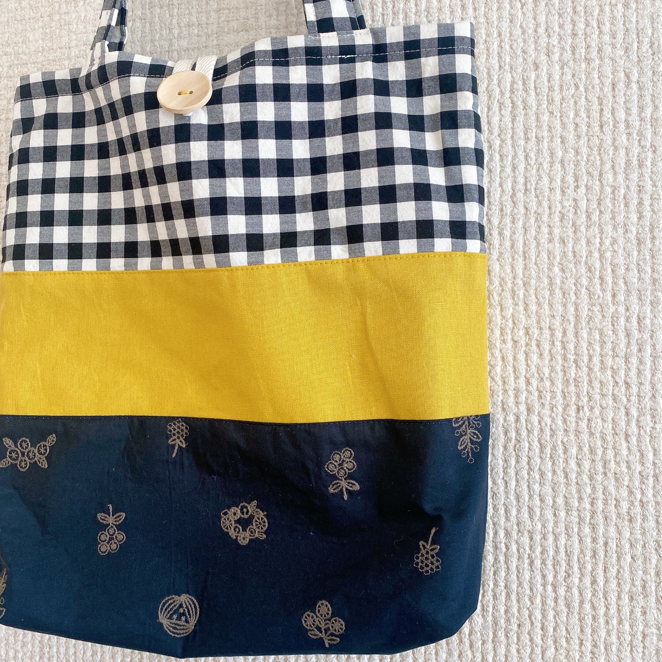 大きな内ポケット付きのA4トートバック(いろいろ刺繍×ギンガム・カラシ)