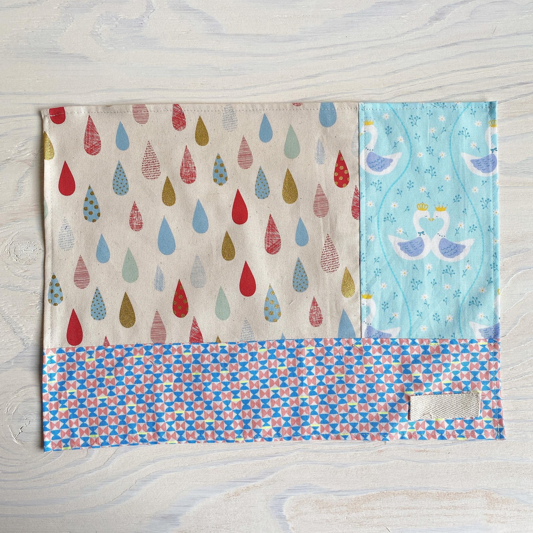 3種類の生地を組み合わせた横長タイプのランチマットです。