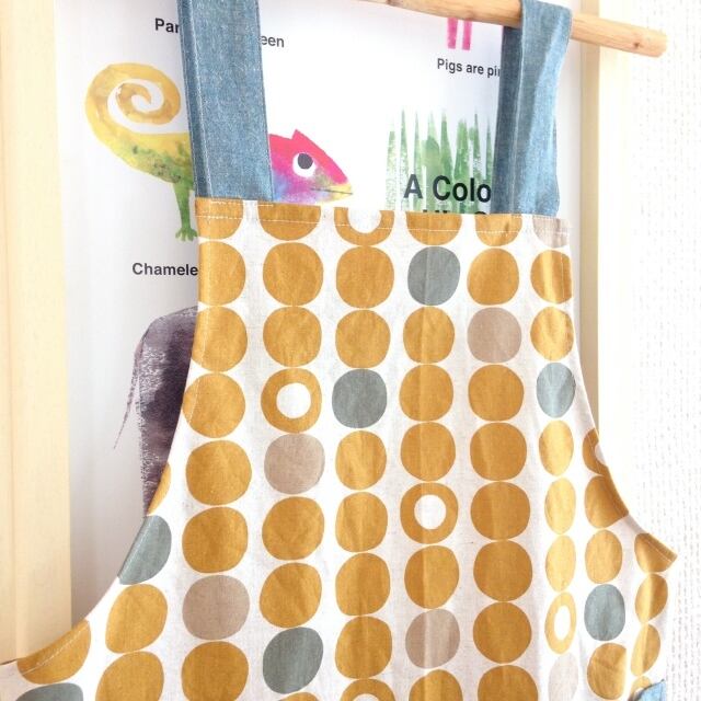 肩ひも後ろはHの形。大人エプロン(マル・マスタード)