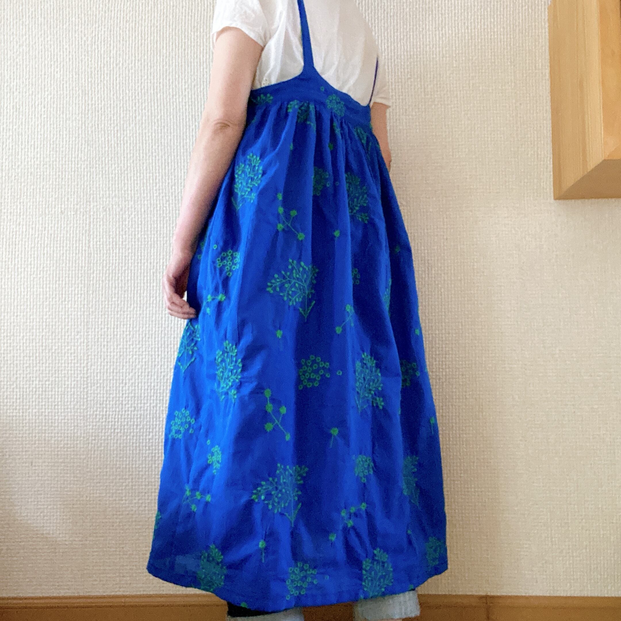 落ち着いたブルーの綿麻シーチング生地にきれいなグリーンの刺繍
