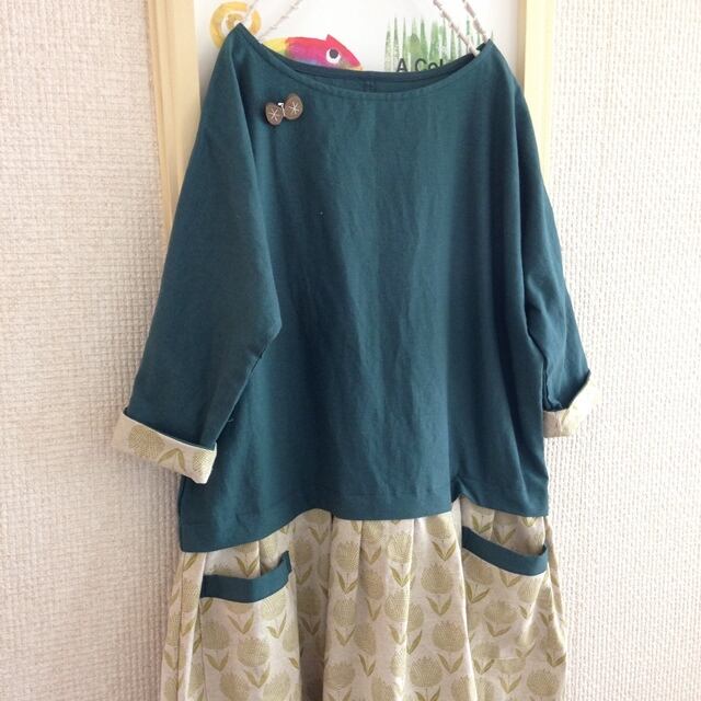 ドルマンスリーブのワンピース*グリーン×オリーブフラワー