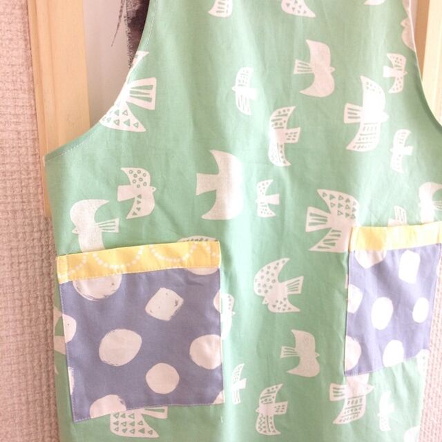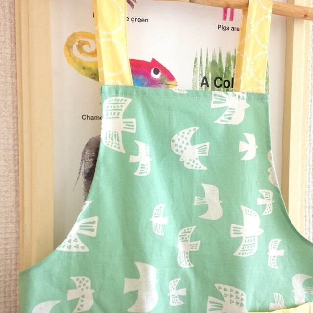 肩ひも後ろはHの形。おとなエプロン(バード・ミント)
