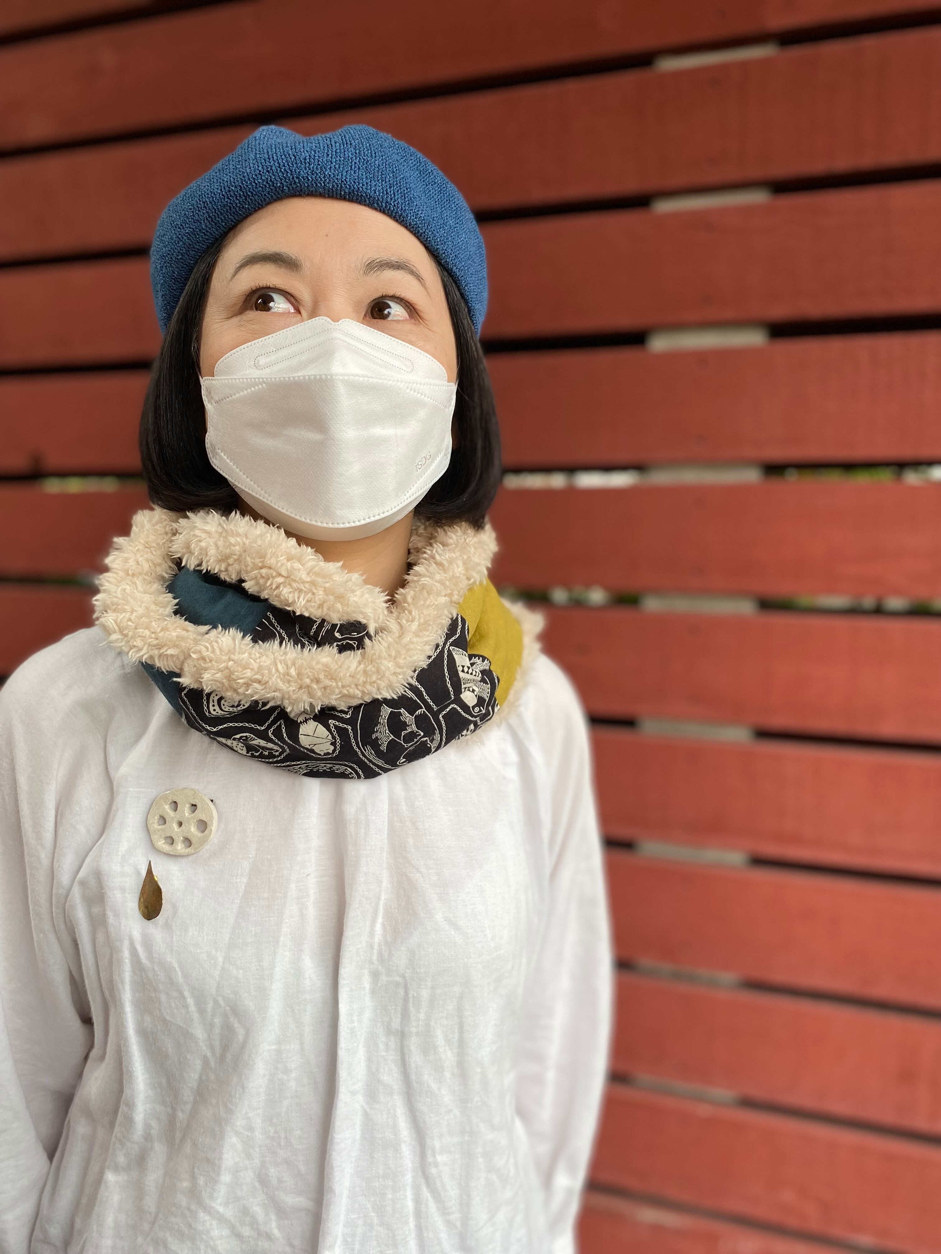 着用している写真は、柄違いの同じ形のスヌードです。