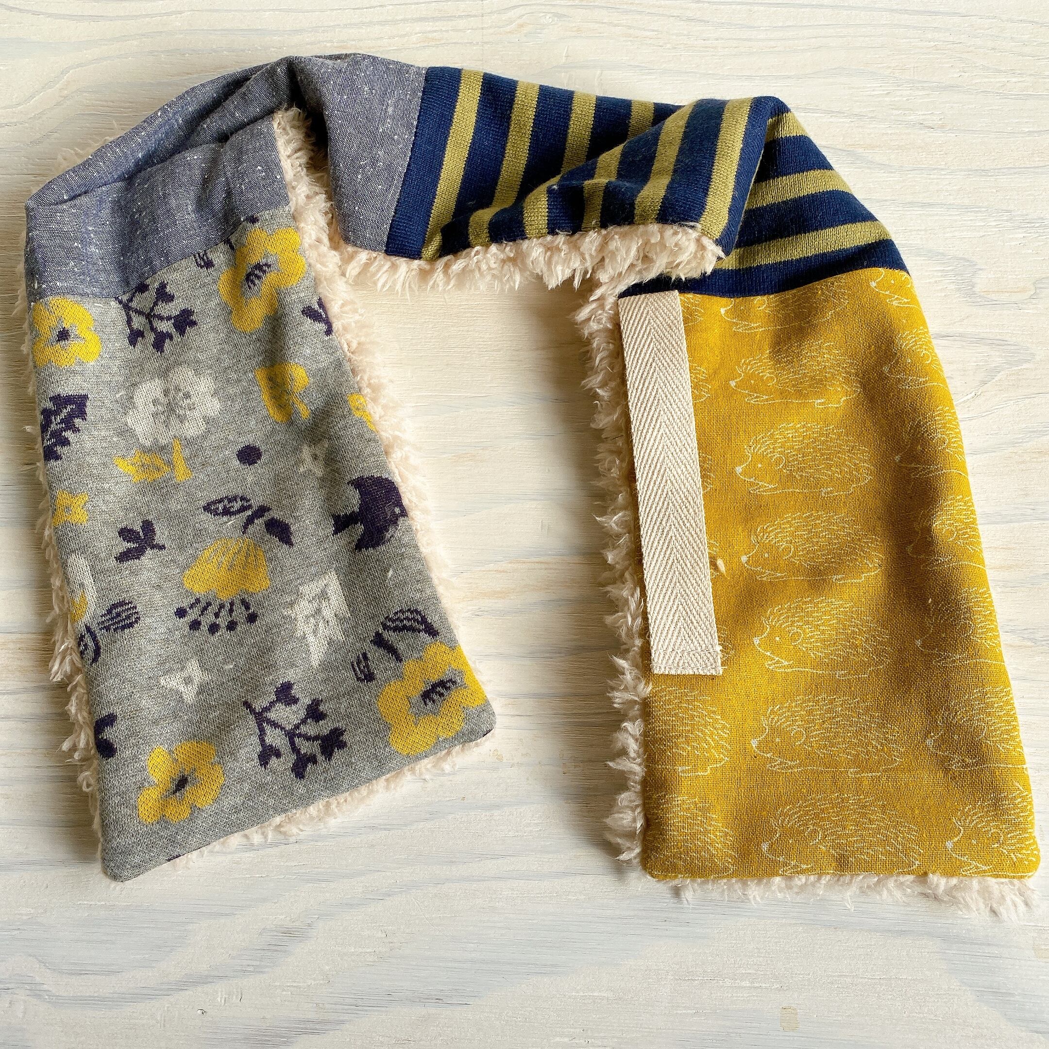 結んだりまいたりしない、テープにくぐらせる着脱楽ちんなショートマフラーです。