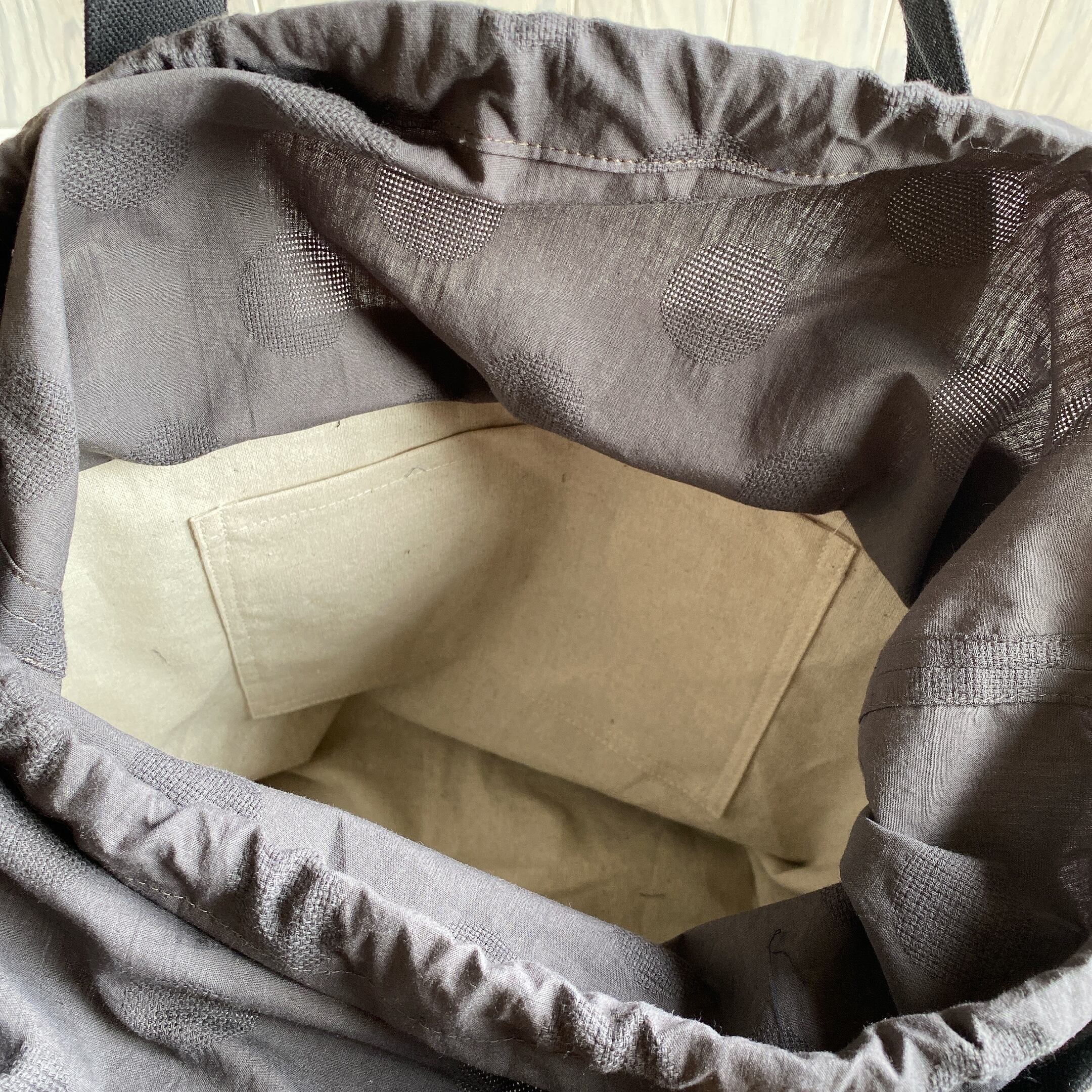 巾着の生地は綿麻素材で、ドットの模様でおられています。