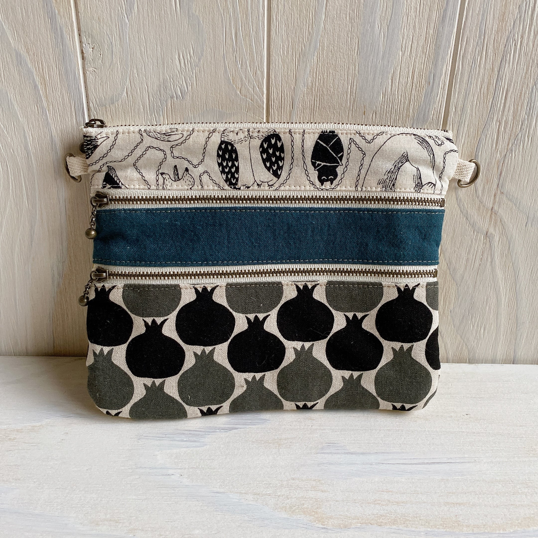 サコッシュにもなる3ファスナーフラットポーチ(ザクロ・クロ)