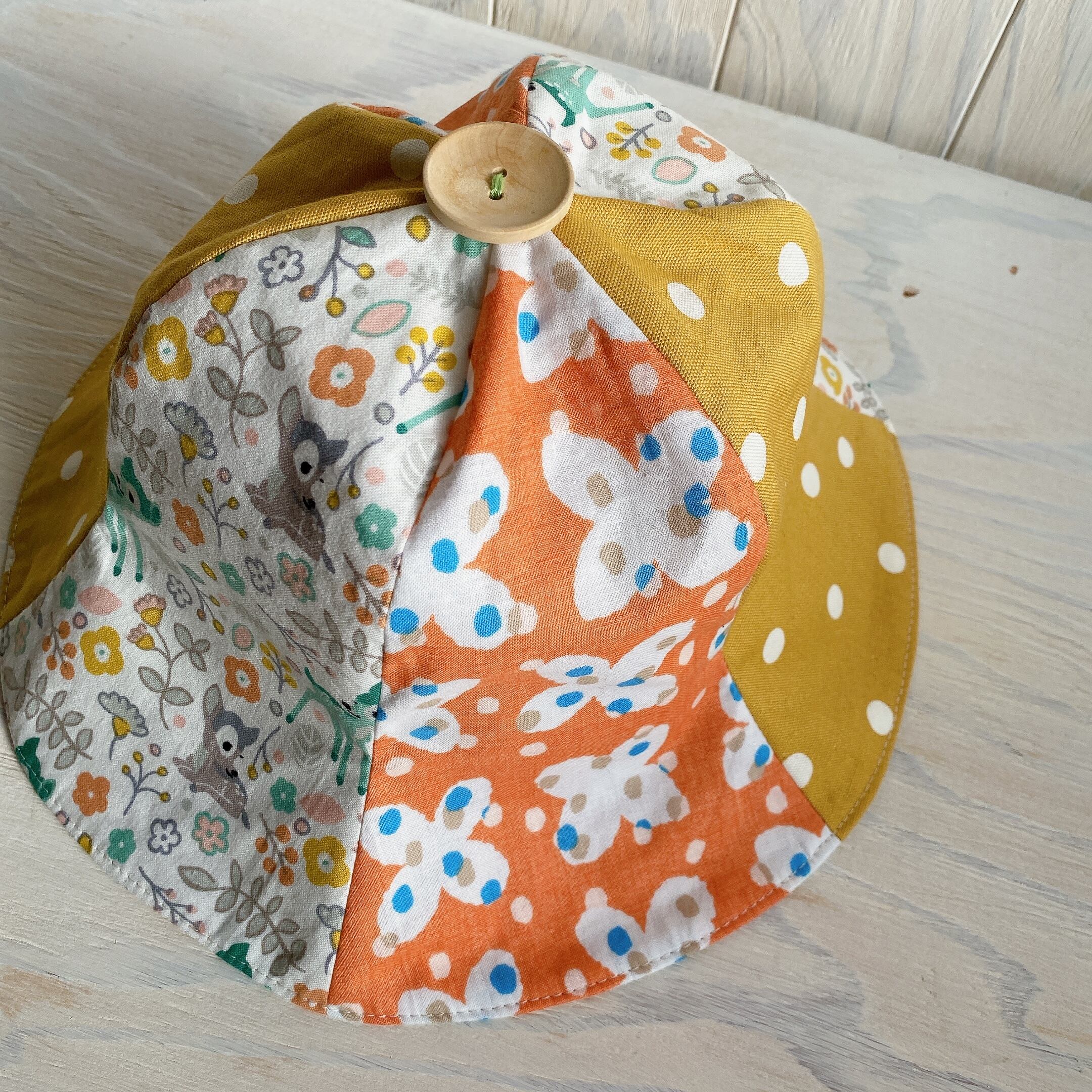 相性の良い3色の生地を組み合わせてチューリップハットにしました。