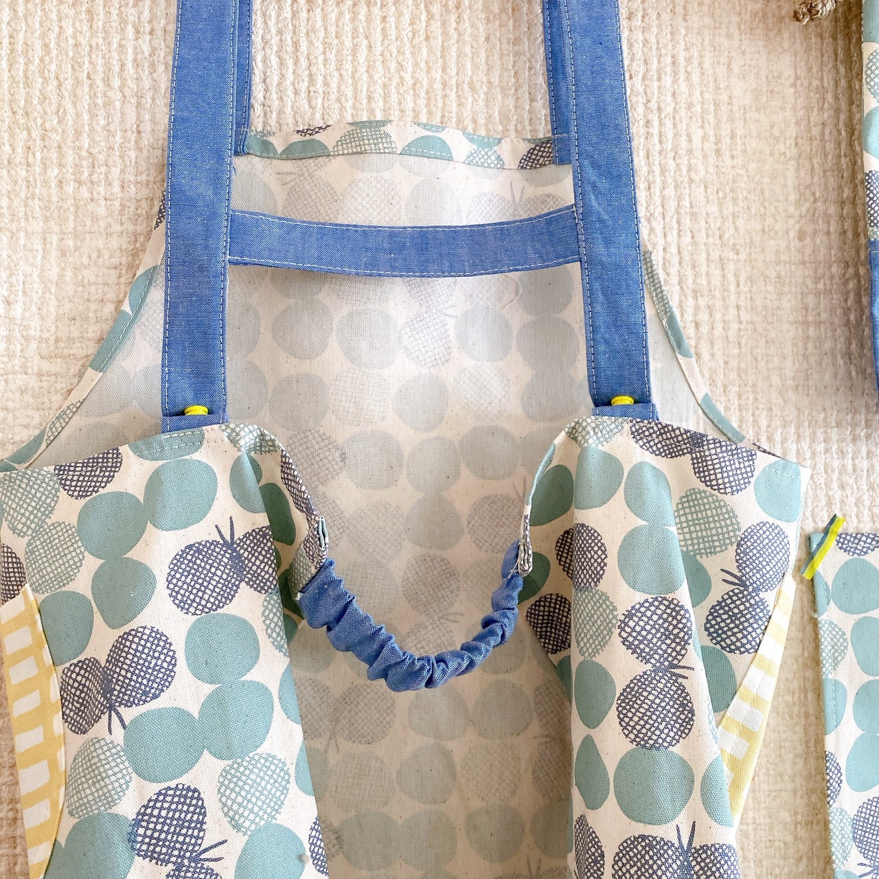 エプロンの後ろはシュシュのようにゴムを入れています。