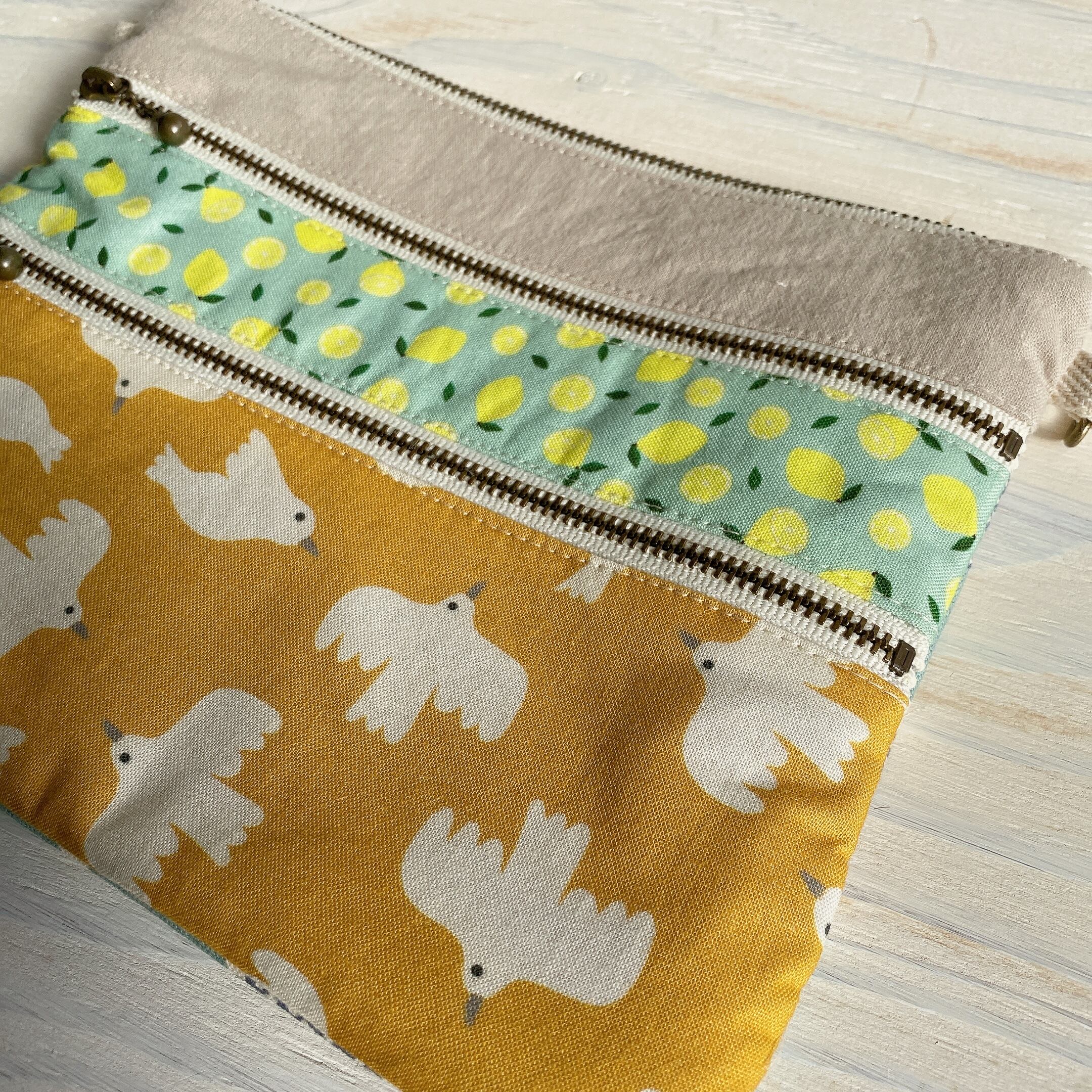 サコッシュにもなる3ファスナーフラットポーチ(キイロとり)