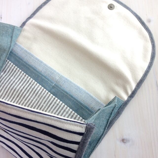北欧風の布を使ってふんわりワタ入りのマルチケースを作りました。