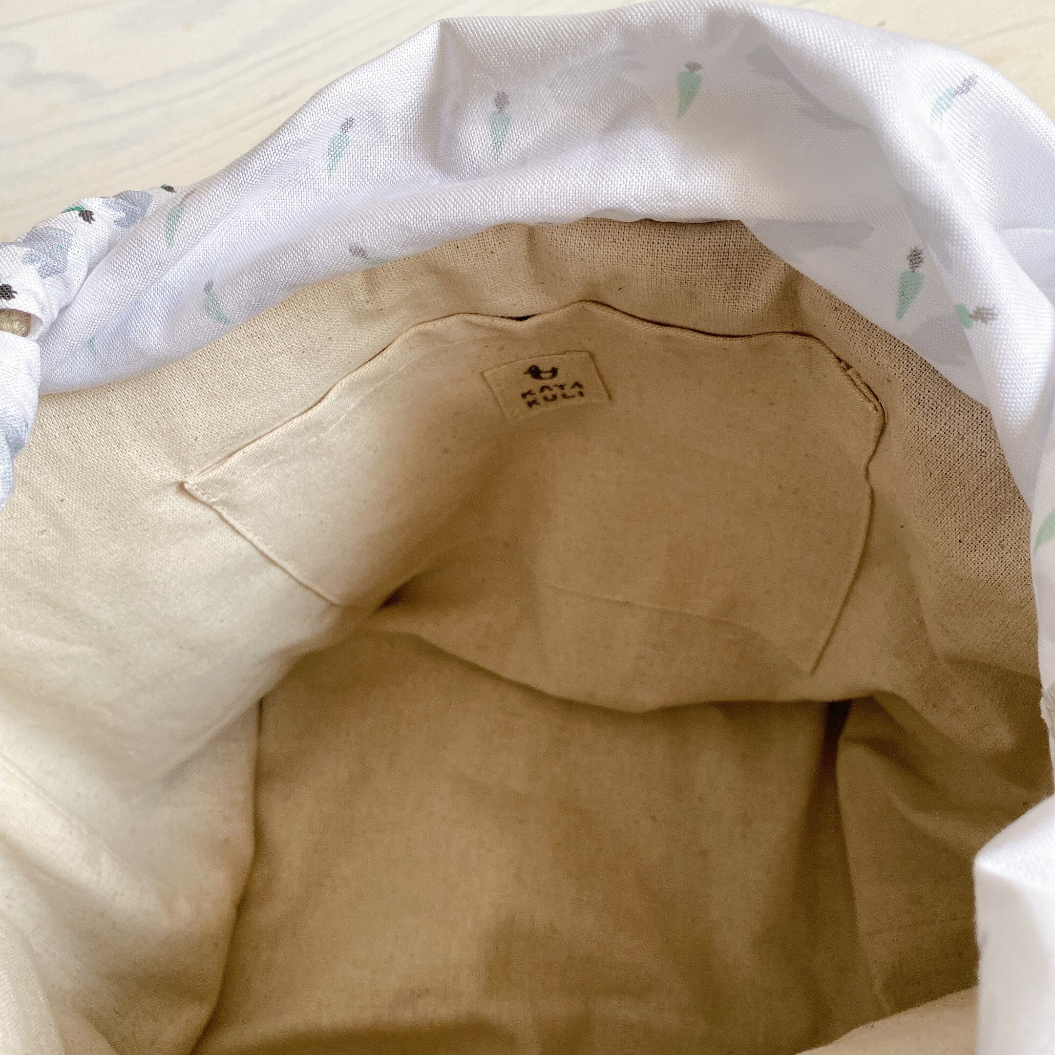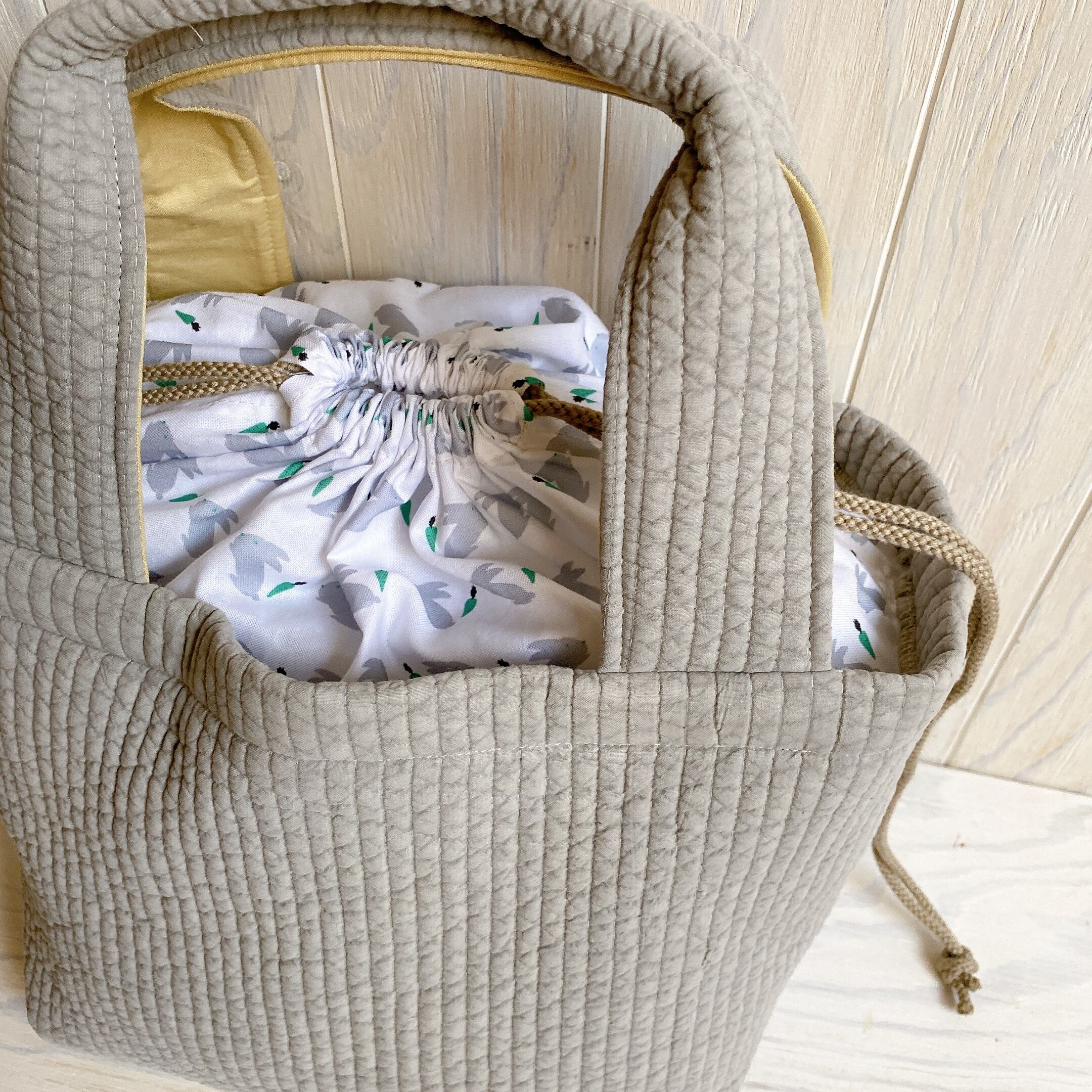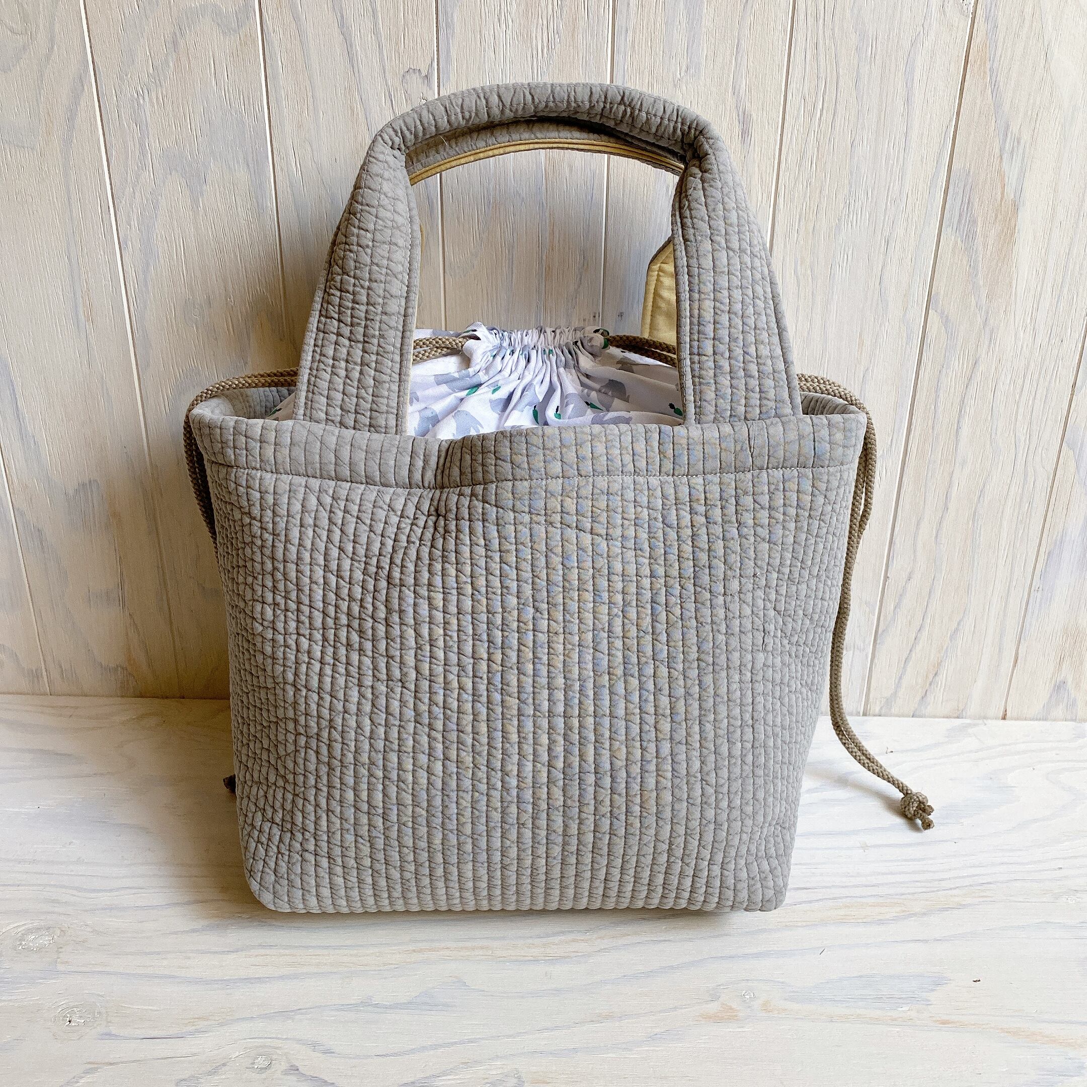 たっぷり収納できる大き目マチ型プリの巾着付きトートバック
