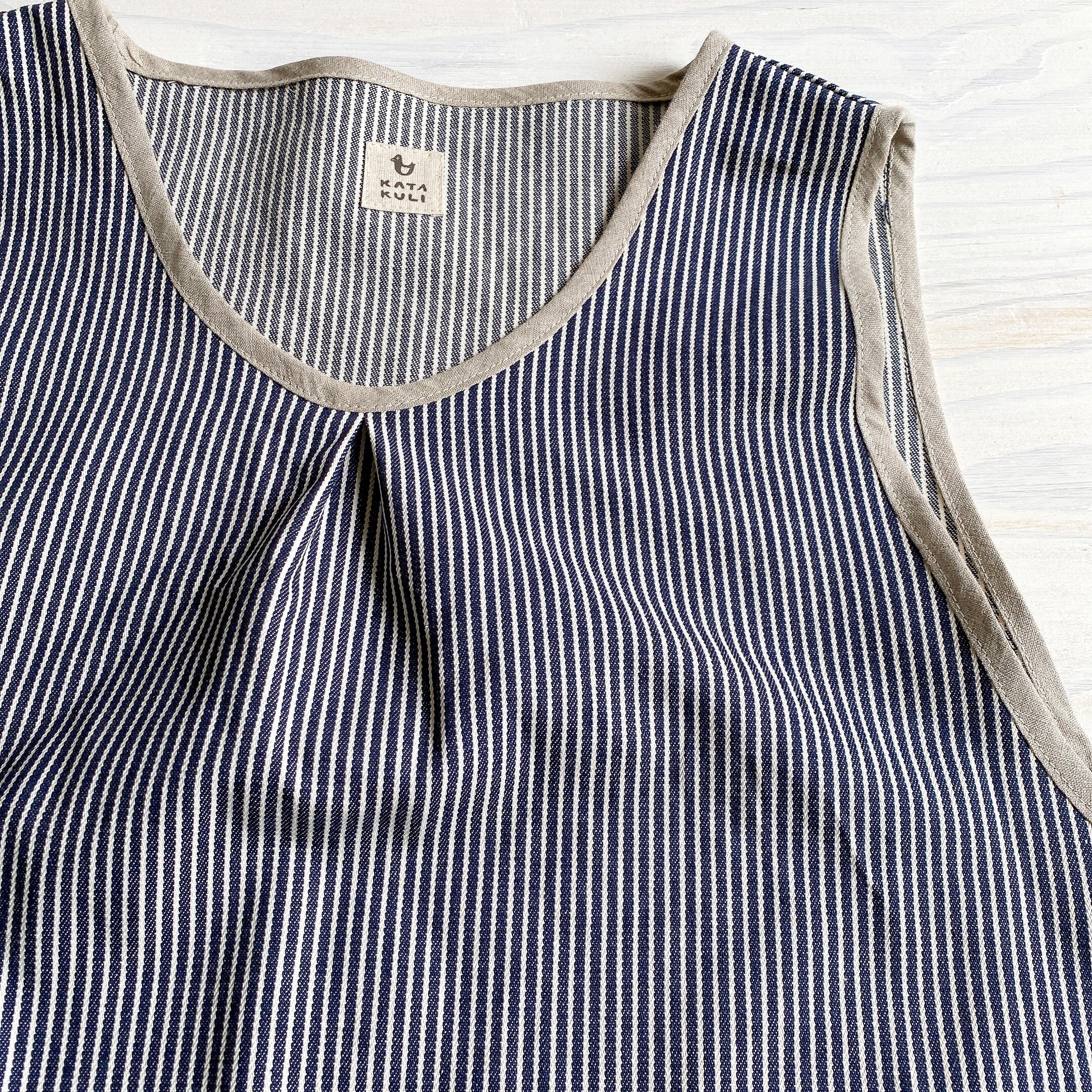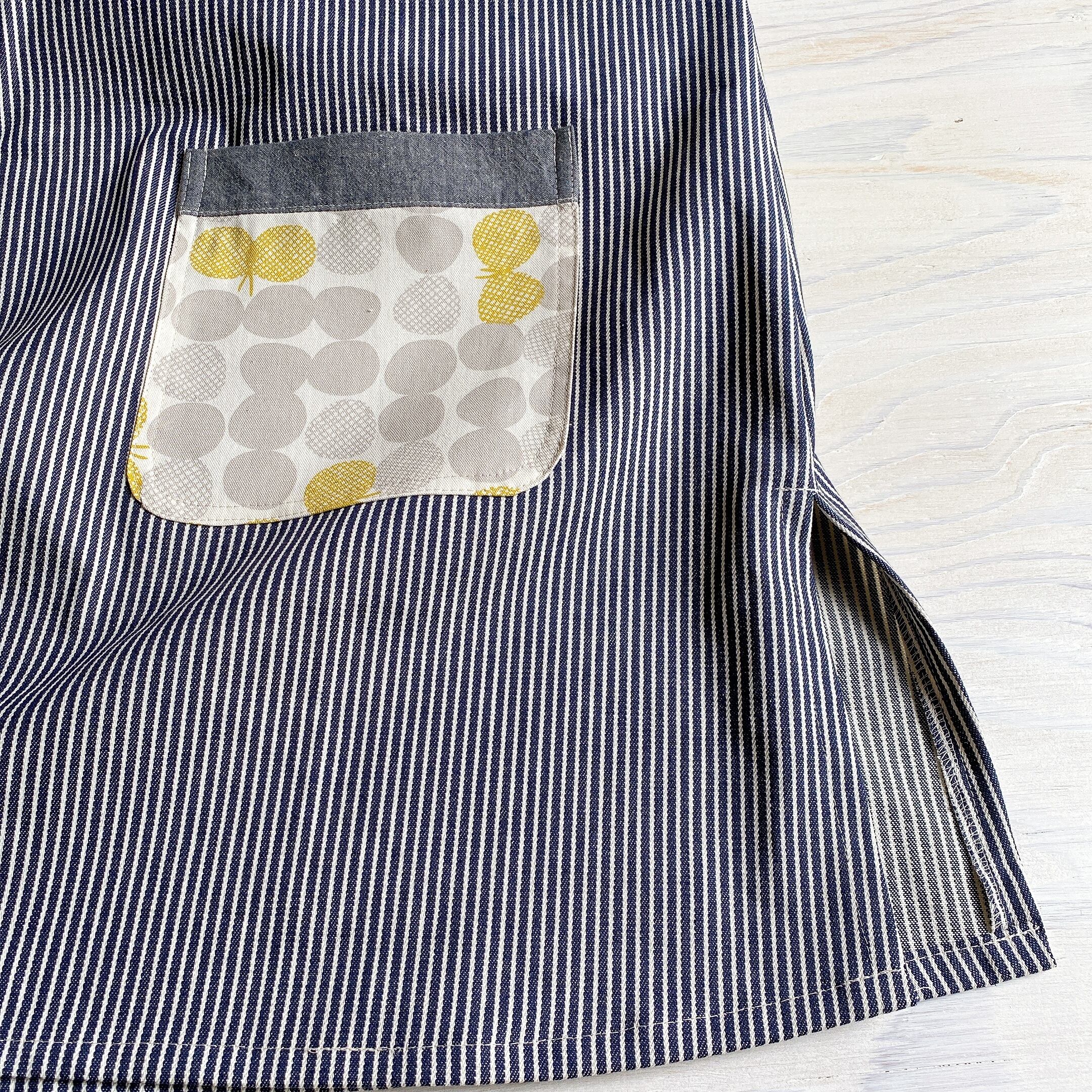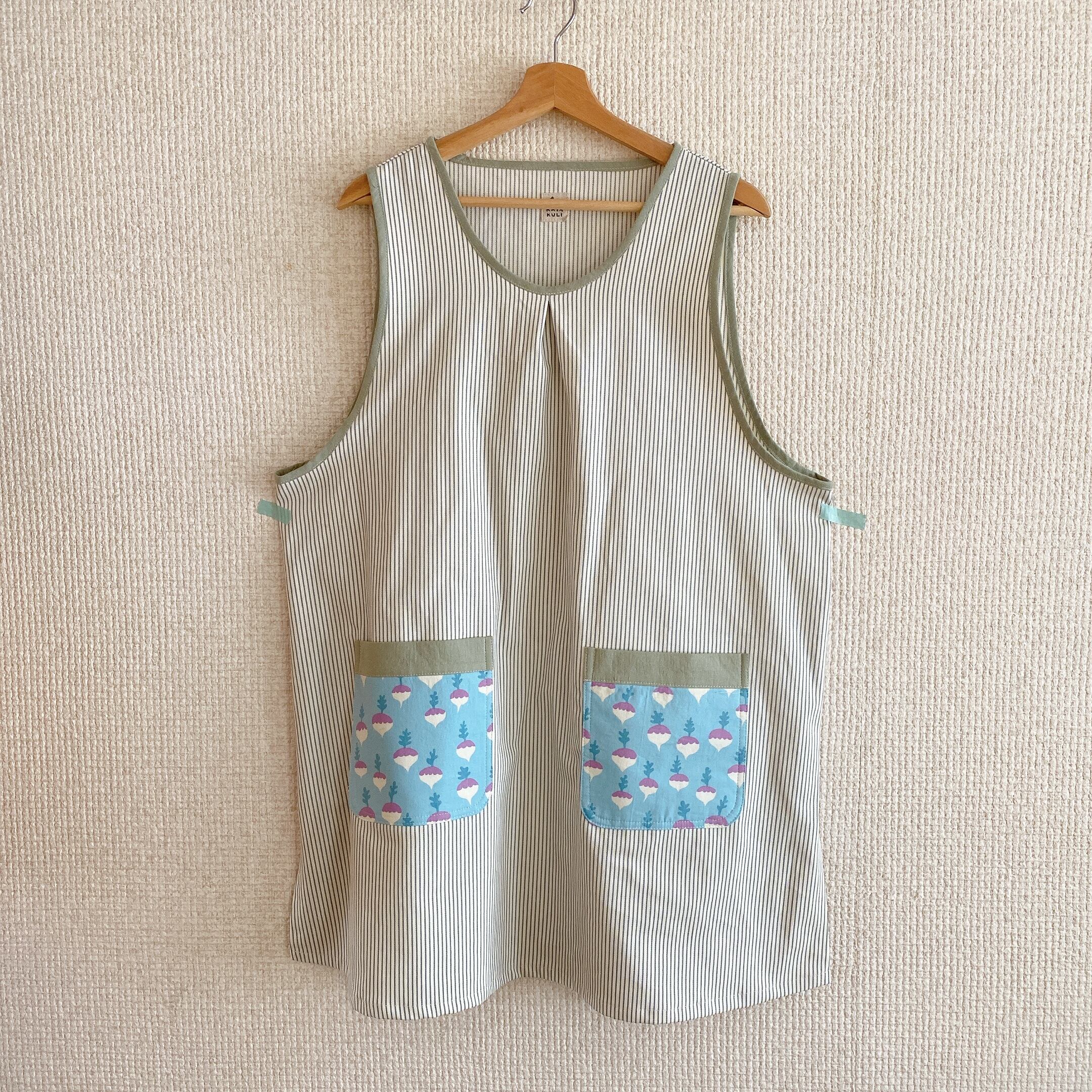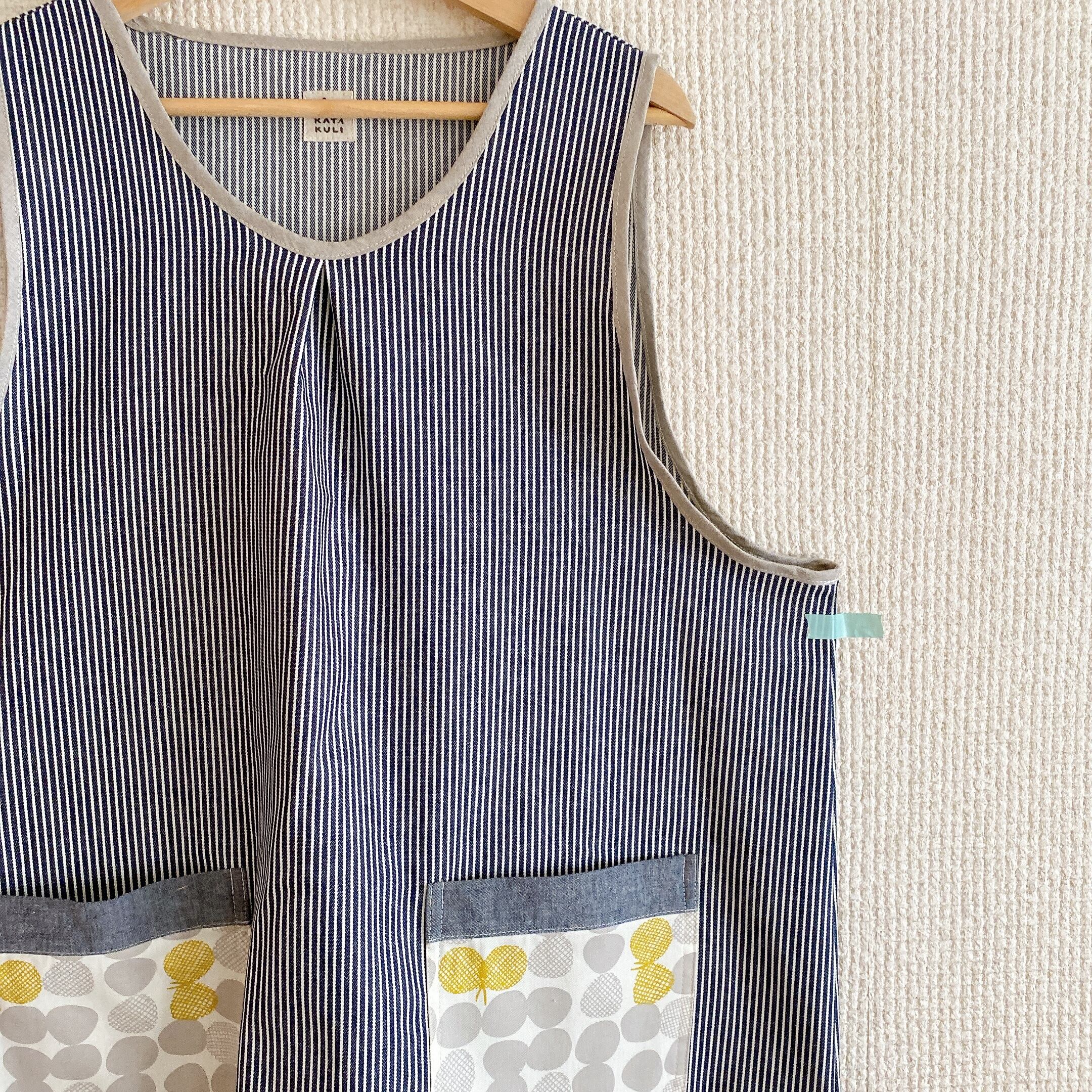 かぶるタイプのエプロン、脇にはスリットが入っていて動きやすい作りにしました。