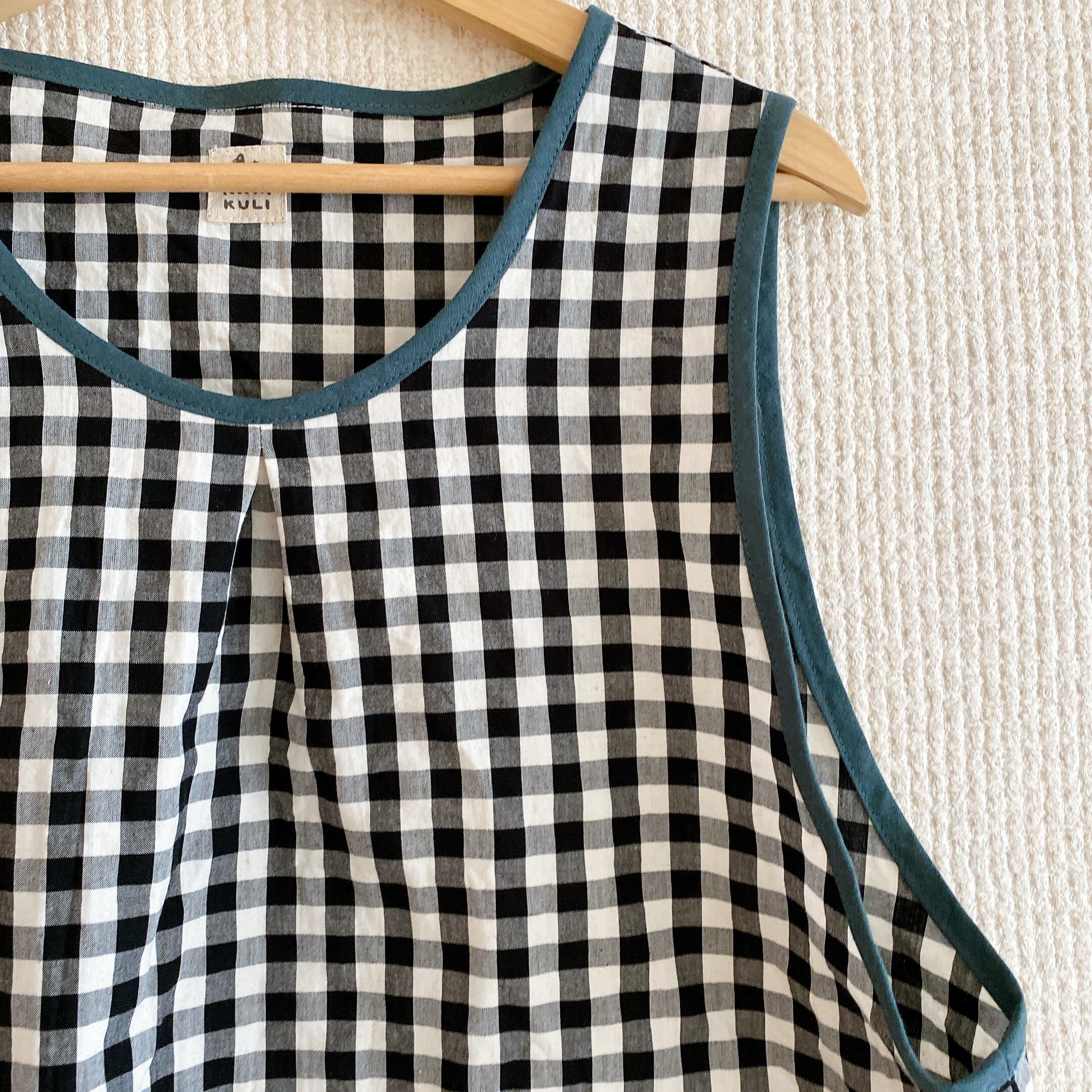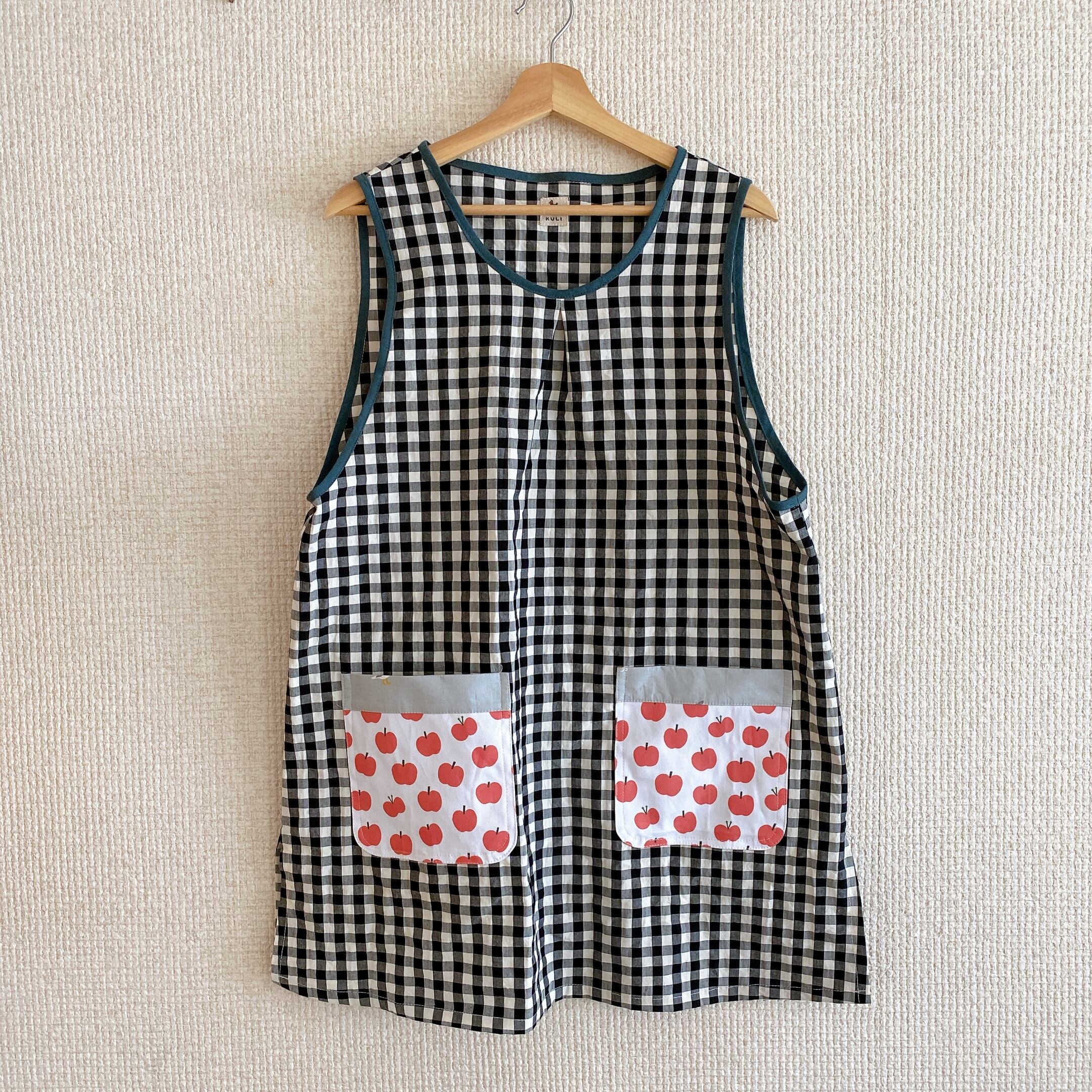 かぶるタイプのエプロン、脇にはスリットが入っていて動きやすい作りにしました。