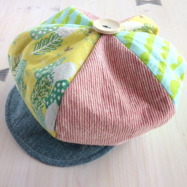 相性の良い3種類の生地を組み合わせて賑やかなキャスケットにしてみました。