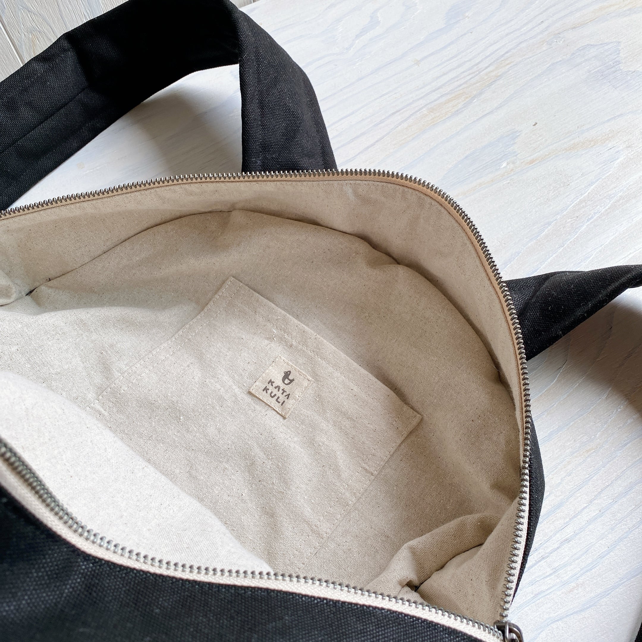 本体は弱撥水加工の8号のハンプと柄の生地は芯を張った綿麻の生地を使い、