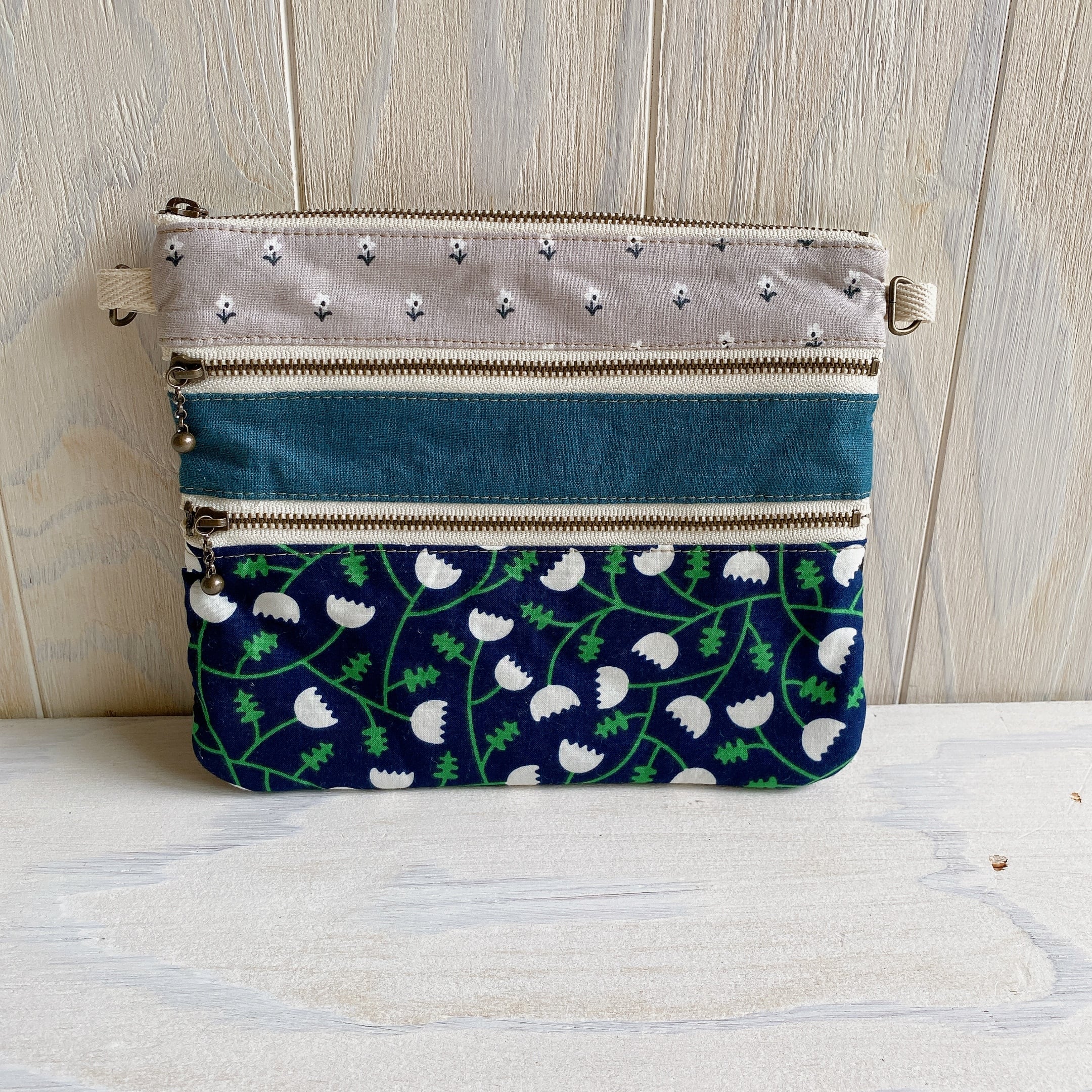 サコッシュにもなる3ファスナーフラットポーチ(しろはな)