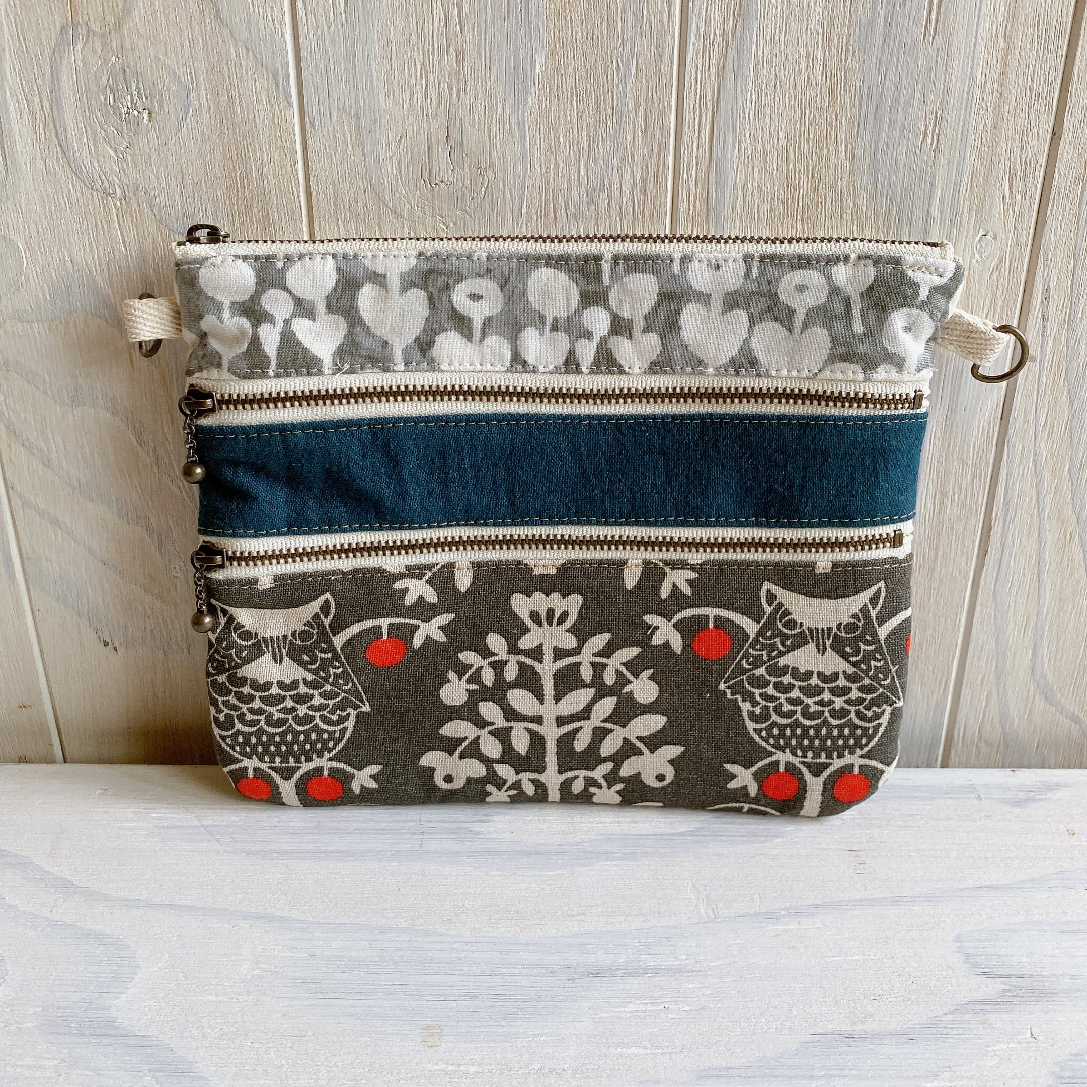 サコッシュにもなる3ファスナーフラットポーチ(ふくろう)