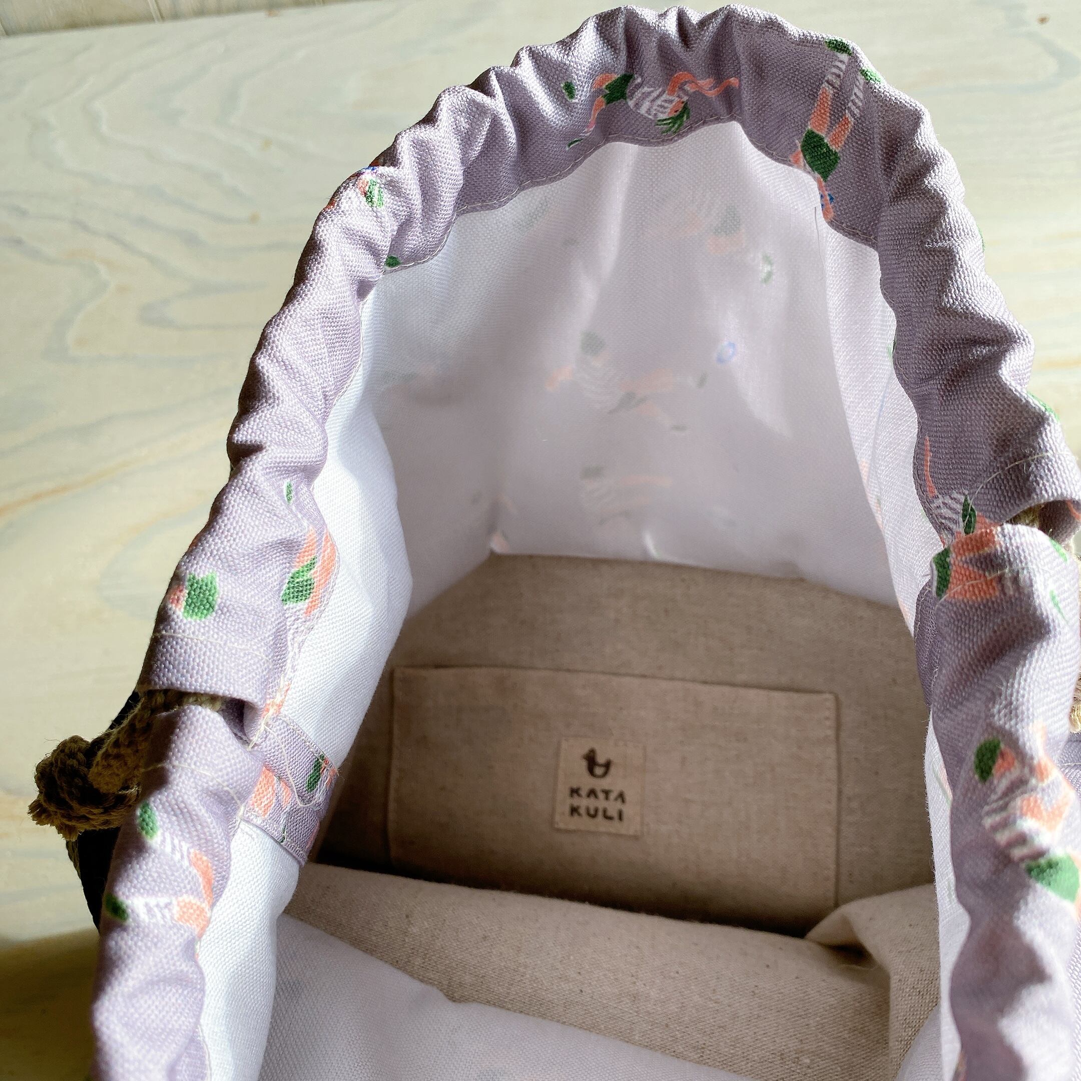遊び心いっぱいの生地を巾着部分に使いました。