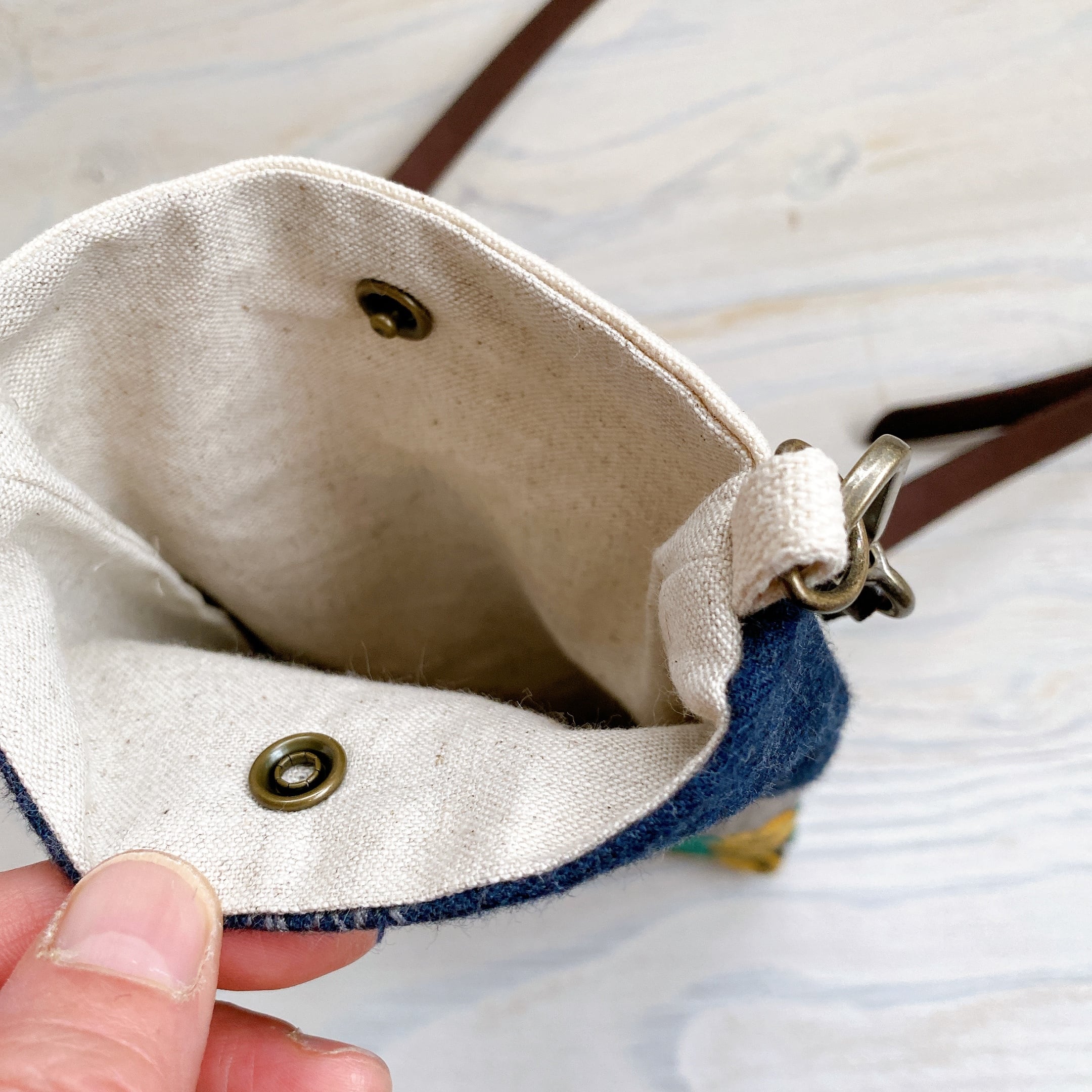 入り口のスナップボタンがスマホがうっかりポーチからこぼれるのを防いでくれます。