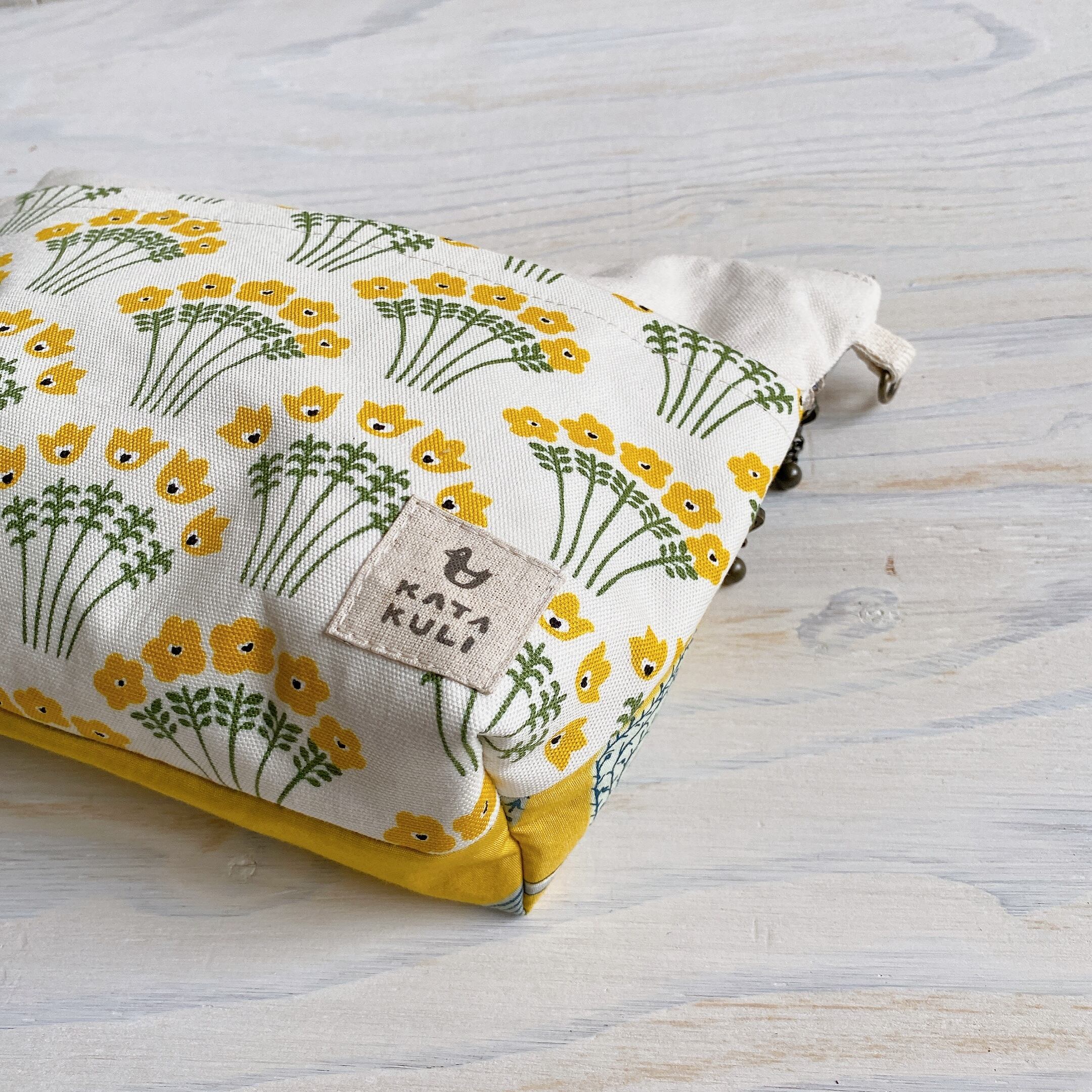 マチ付き3ファスナーポーチ・ポシェットにもなります(お花・キイロ)