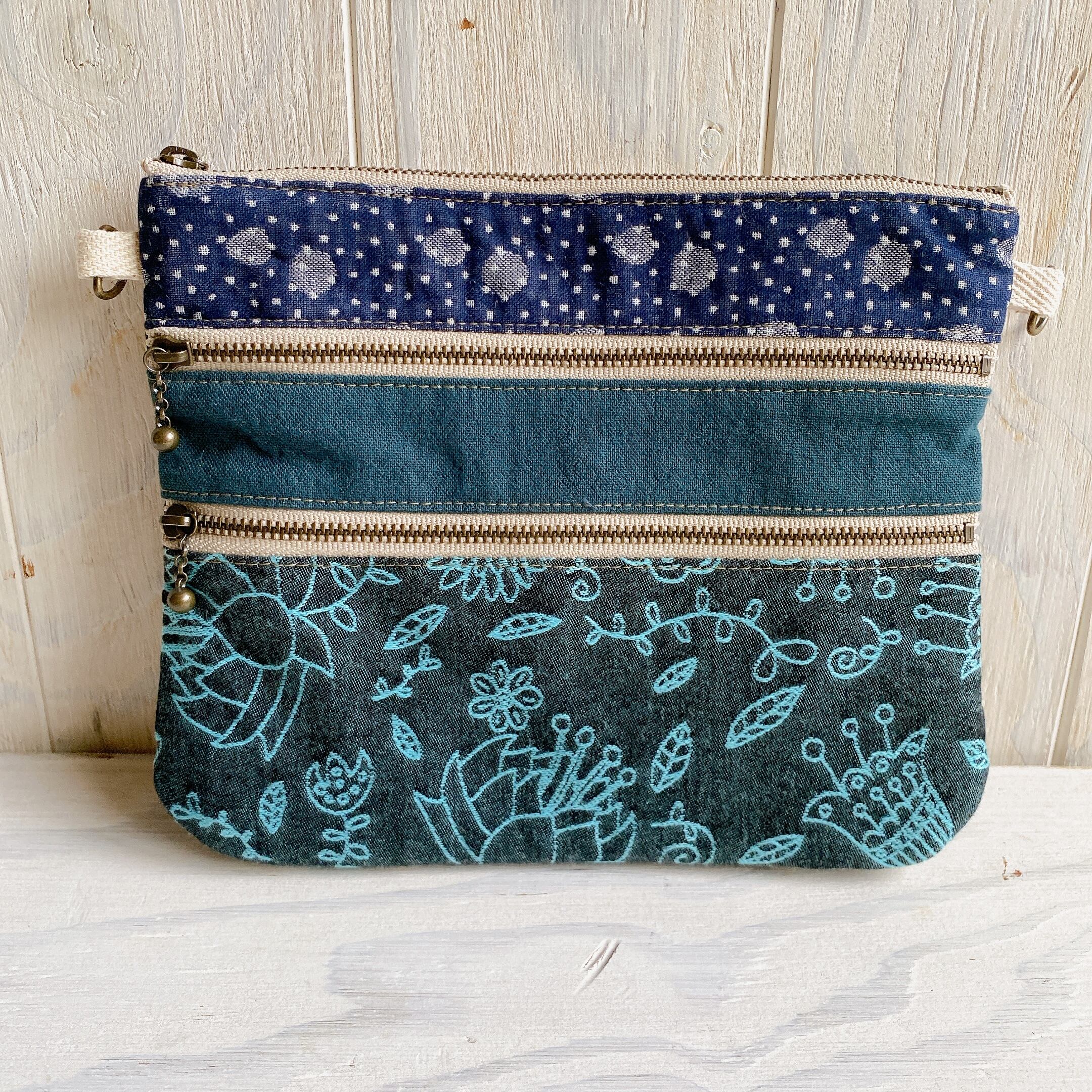3ファスナーフラットポーチ・サコッシュにもなります(青い花)