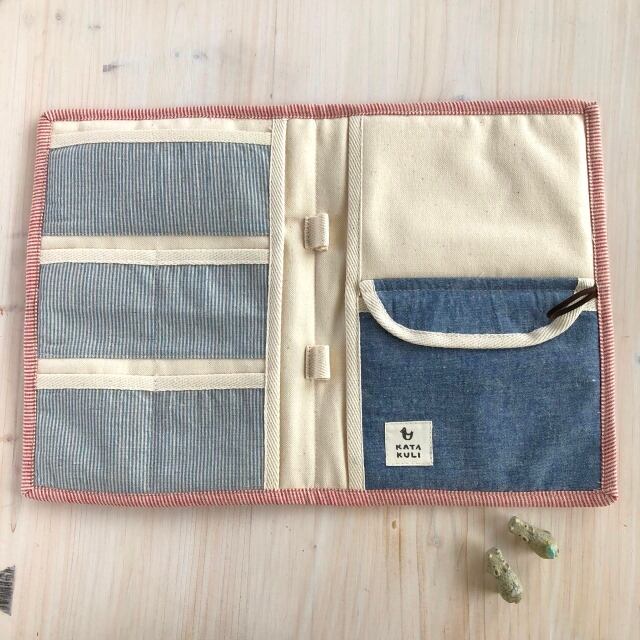 両サイドにもポケットがついていてA5サイズのノートが収まります。。