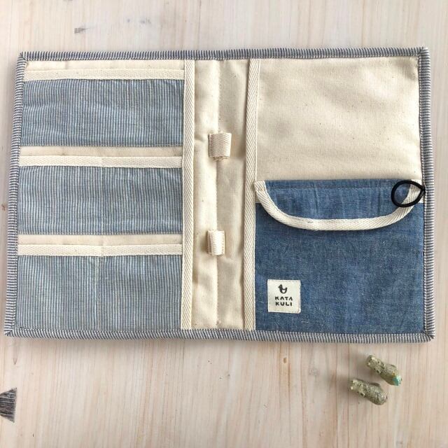 両サイドにもポケットがついていてA5サイズのノートが収まります。。