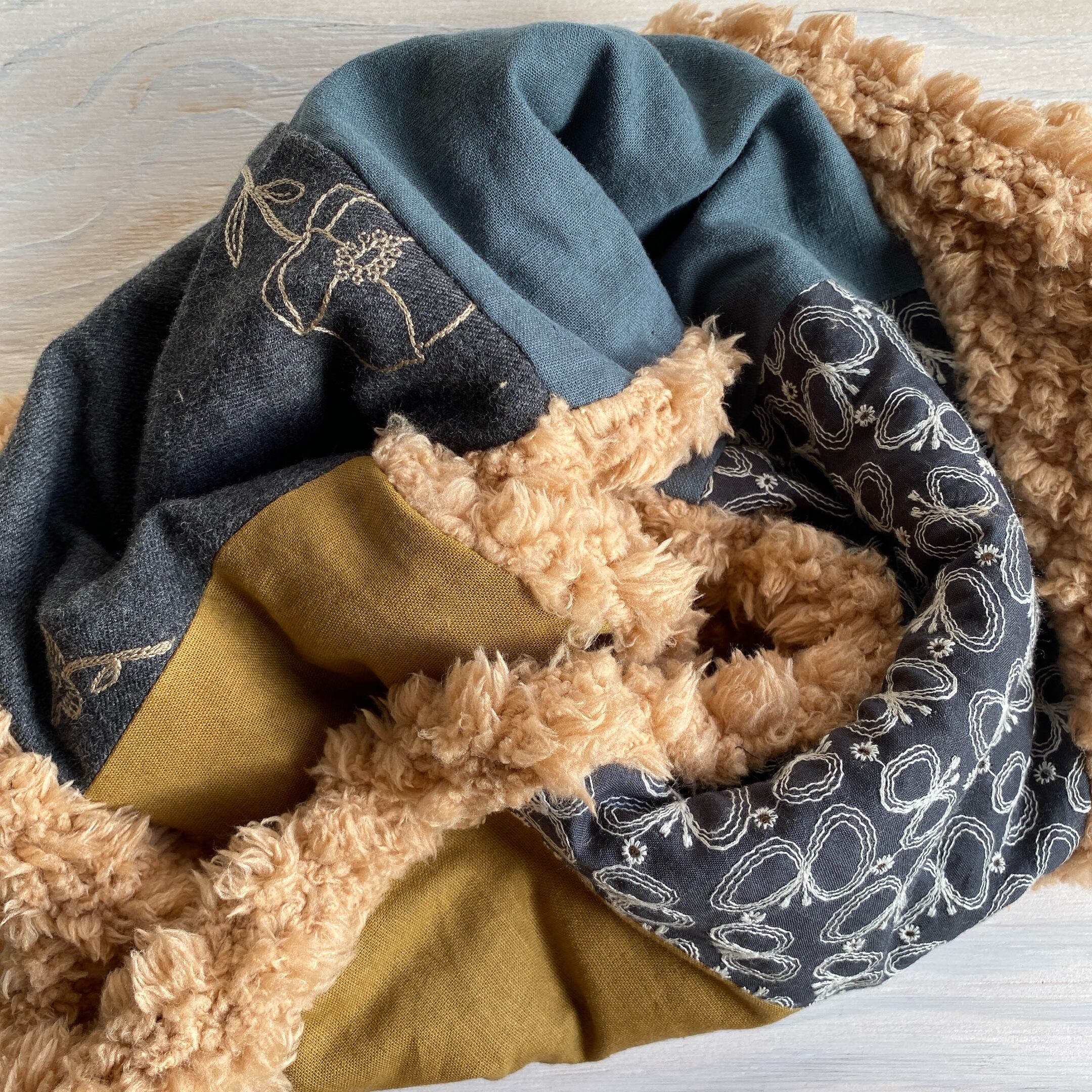ねじれのmixスヌード(ちょうちょ刺繍と濃いグレー刺繍)