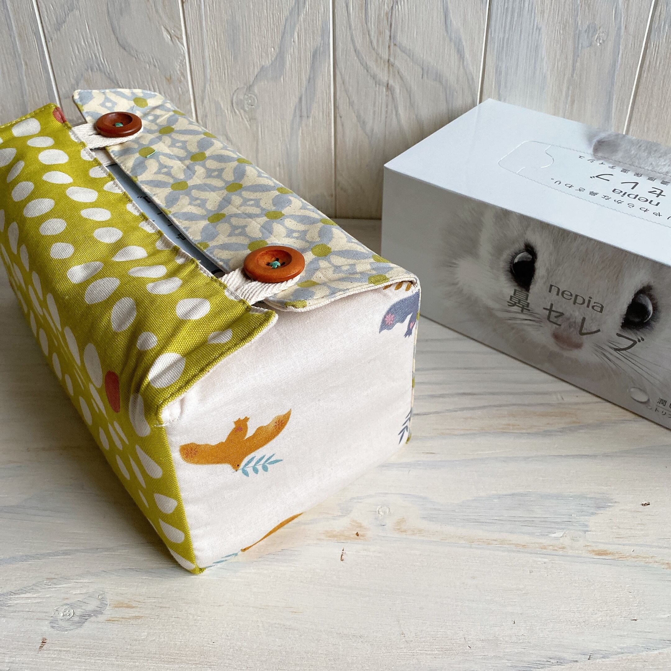 ボックスティッシュを入れて、上のボタンを留めるとぴったりフィット