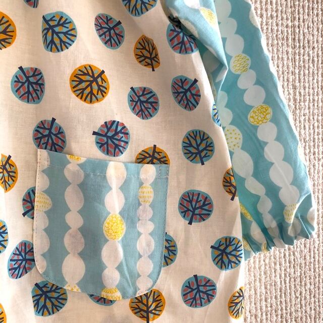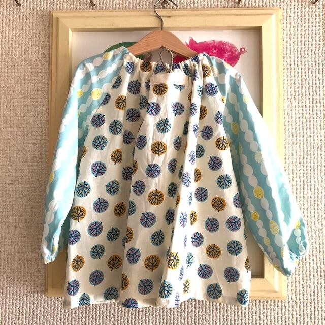 ふんわりやさしい色合いのこどもらしい生地でスモックを作りました。